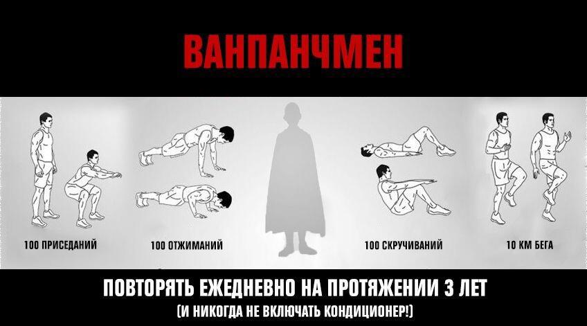 ЗЫ Повторяю и предупреждаю, ванпанчмэн челлендж надо делать с умом, постепенно увеличивая норму. Результаты многих фитнес-блогеров на Ютубе это как раз и показывают. Но сразу бросаться делать сотку того, другого, третьего и 10 км бега — самовыпил из здоровой жизни.