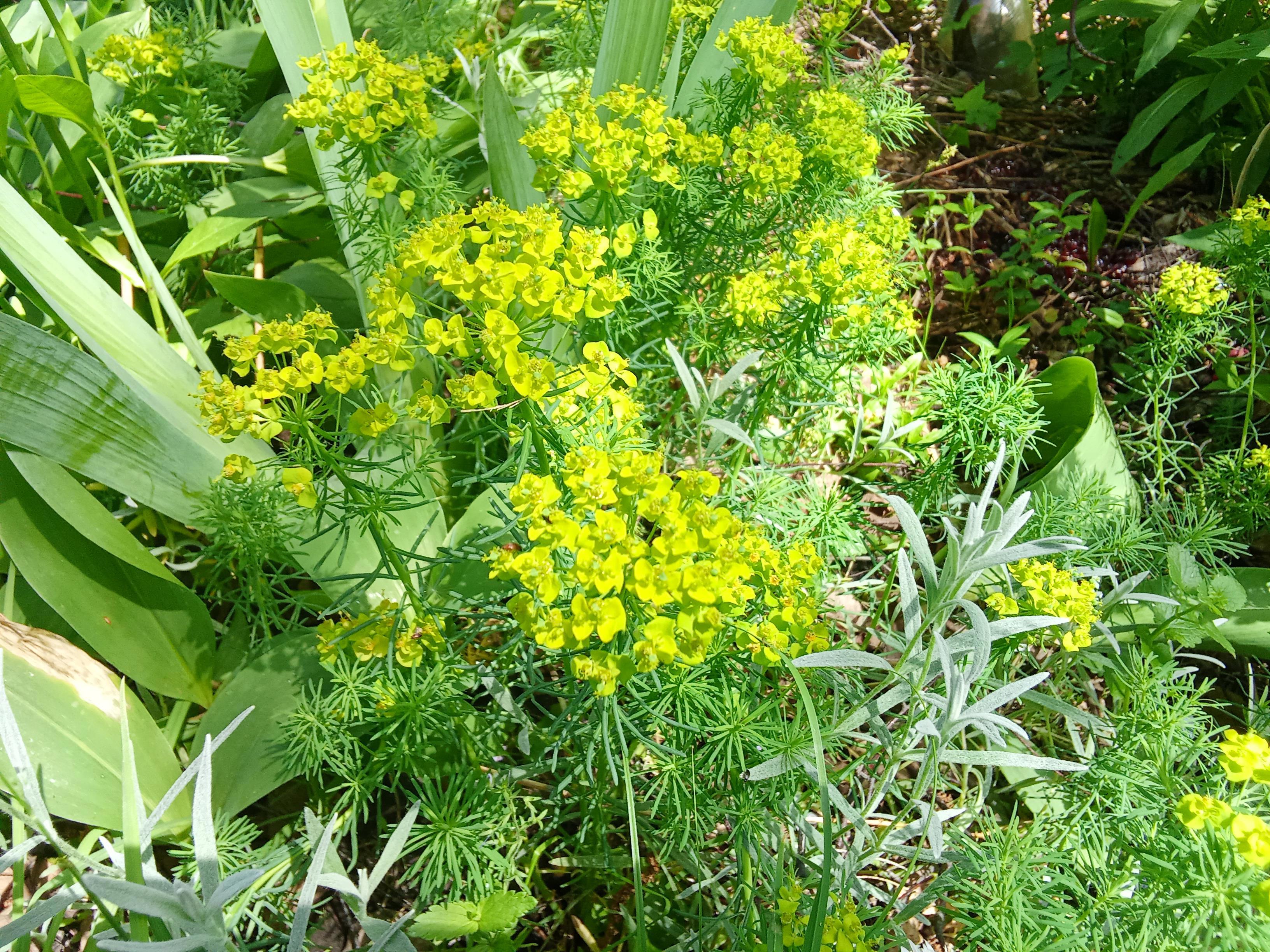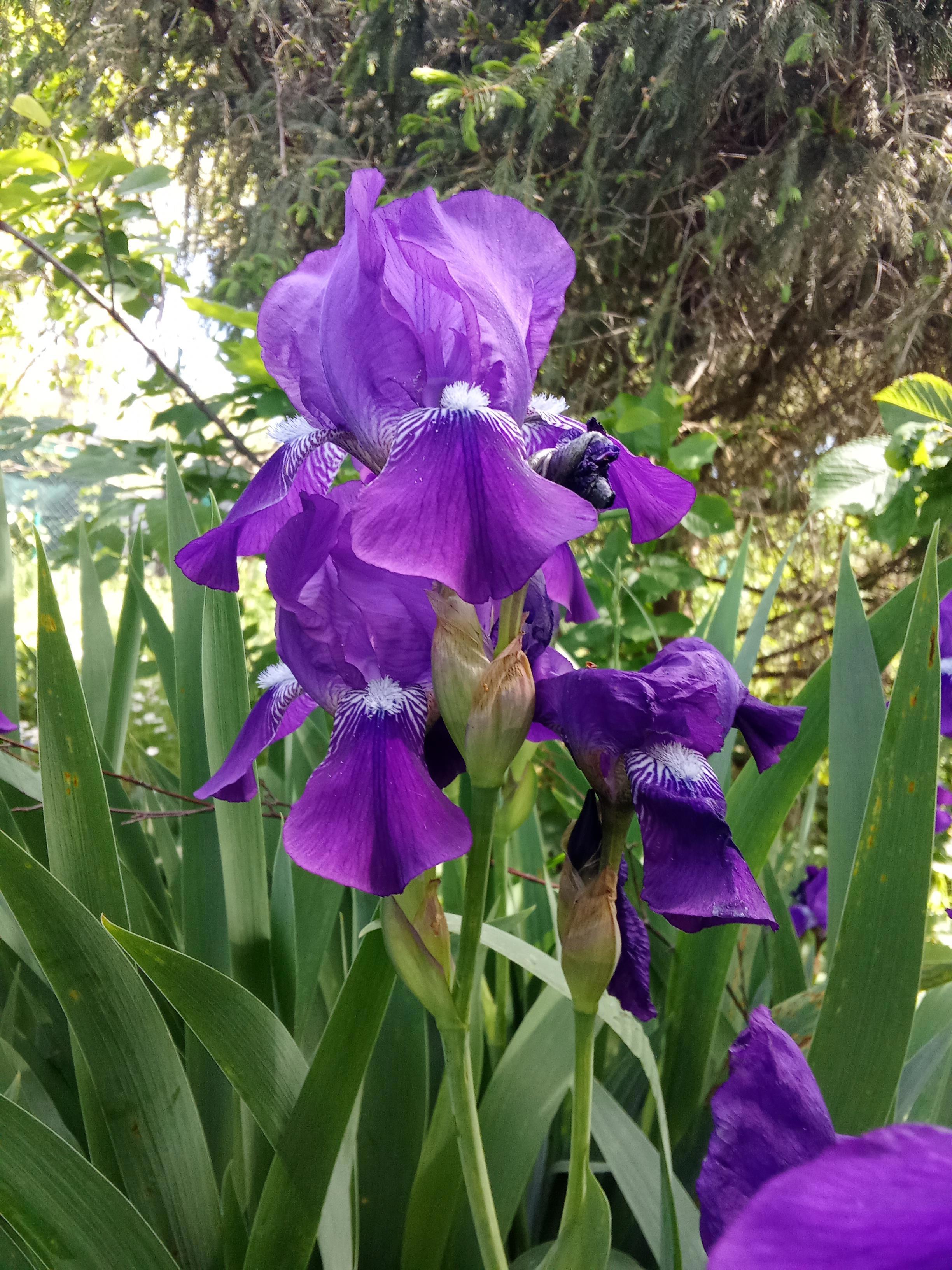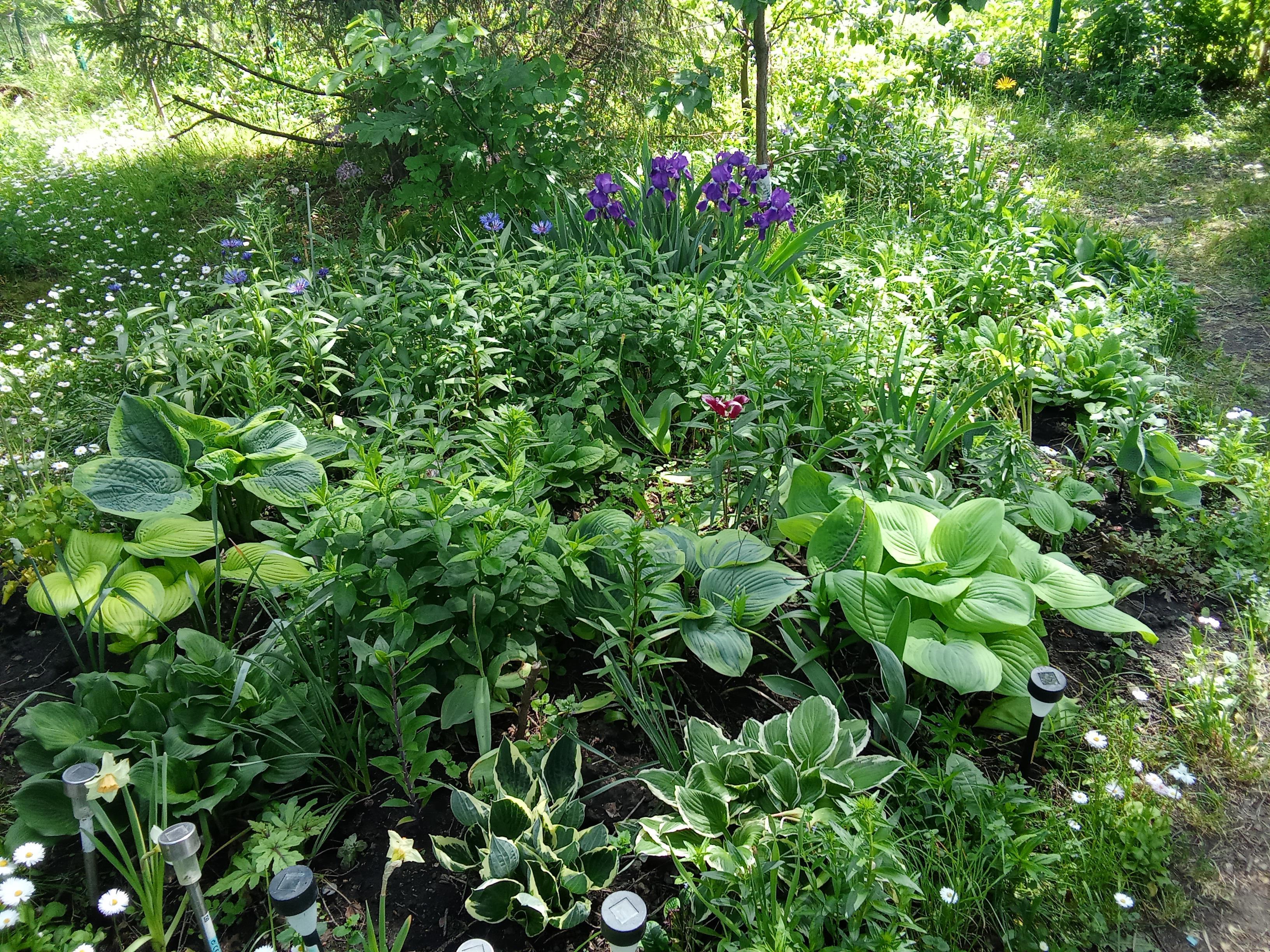 Моя вдохновленческая клумба. Я ее вижу в окно, когда работаю. Сейчас на ней цветут только ирисы. Тюльпаны и нарциссы почти отошли, а хосты ещё не развернулись во всю ширь.