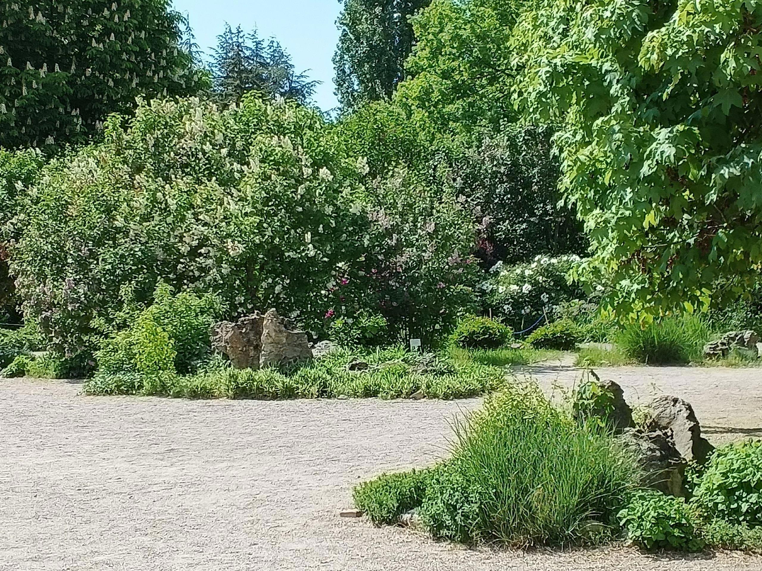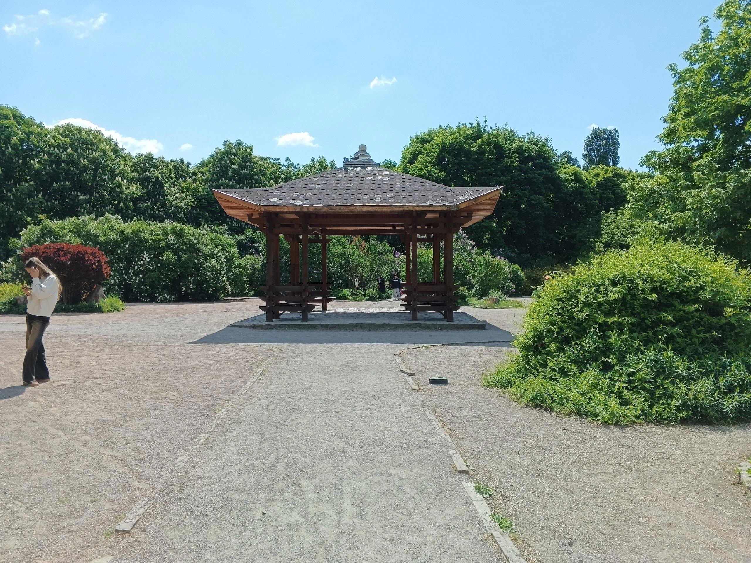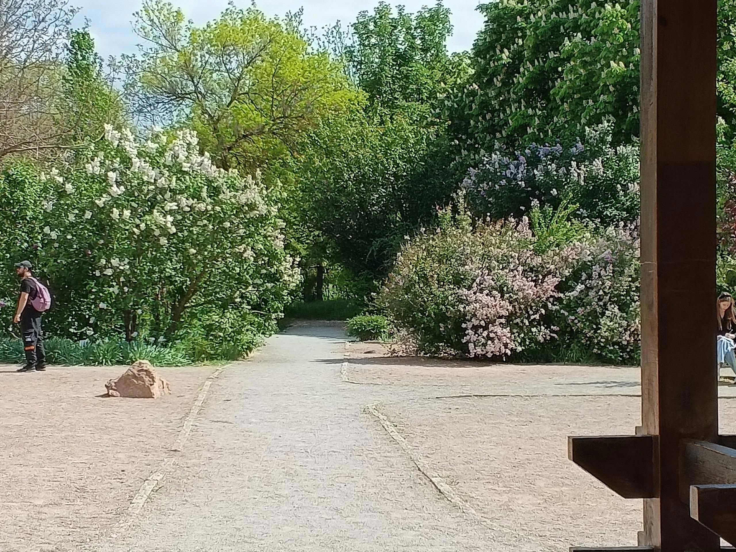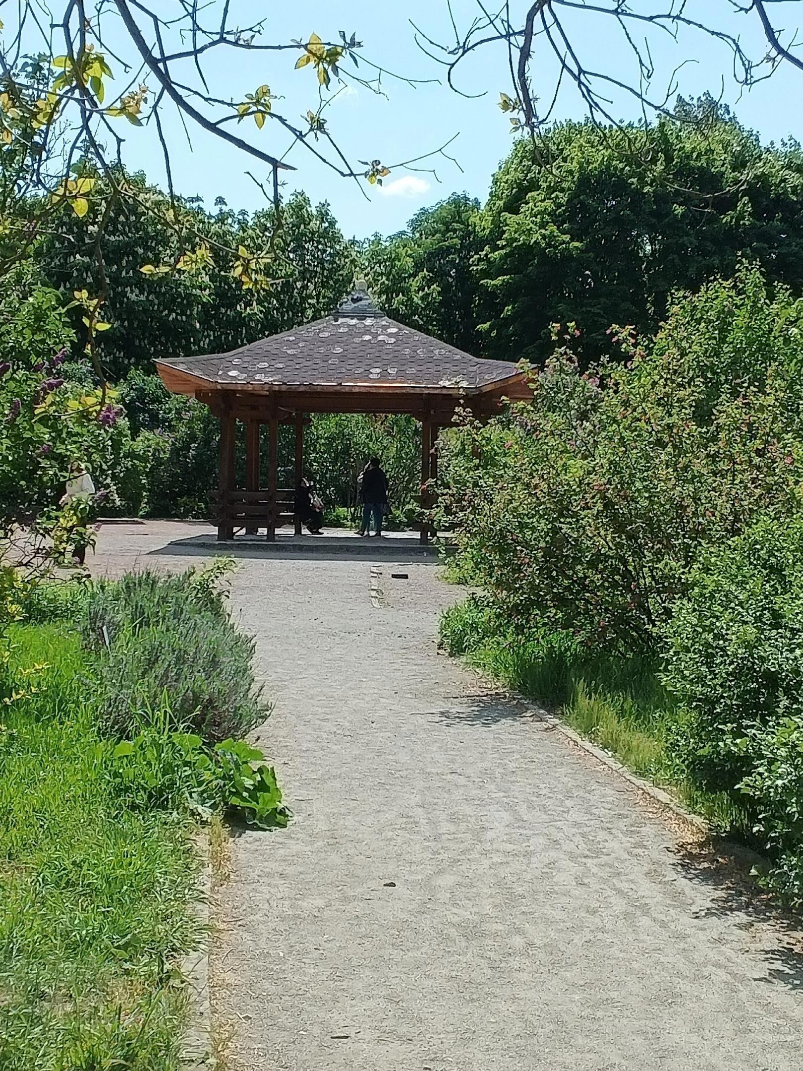 Мы пришли в этот очаровательный уголок парка к исходу цветения сирени. Поэтому не смогли насладиться цветением всех 82 сортов сирени, но и того, что мы увидели нам хватило. Пышные гроздья сирени, изумительный аромат, тепло и лёгкий ветерок создали тот флёр очарования, который сопровождал нас всю прогулку по восточному уголку.