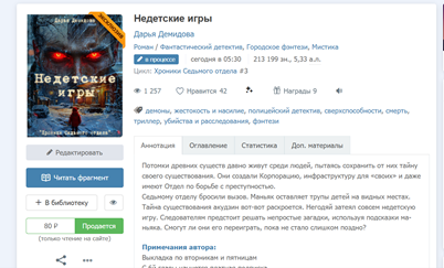 Последний блог был давно и все это время я без дела не сидела. Работала и кое-что заработала. Например, статус "Эсклюзив" на "Недетские игры". Дописать мне осталось 1 главу и, возможно, эпилог, и планирую я закончить сегодня-завтра, так что отныне ускоряю выкладку. Оставшиеся главы будут выходить каждый день. После завершения выкладки, дам неделю на дочитывание и подниму цену.