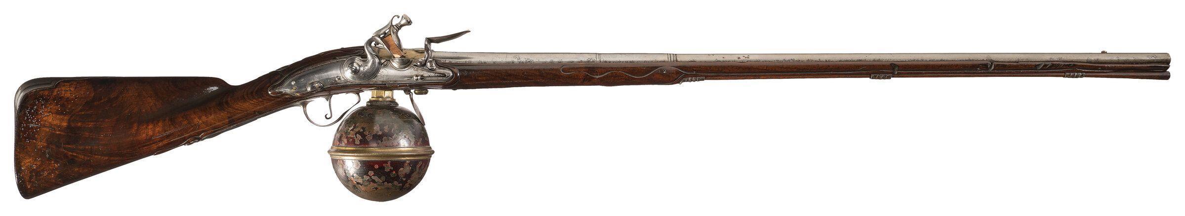 Зато неплохо сохранился образец другого полу-пневматического ружья, созданного примерно в 1680-х лондонским (хотя и выходцем из все той же Голландии) оружейником Эндрю Долепом. Ружжо было комбинированным – то есть имело навинчивающийся резервуар для сжатого воздуха, но при необходимости могло стрелять и как обычное пороховое. Что, в свою очередь, давало возможность скрутившему резервуар стрелку делать морду кирпичом: "вы чо, какое такое бесшумное ружжо! Вот же оно, бахает громе биг бэна!"