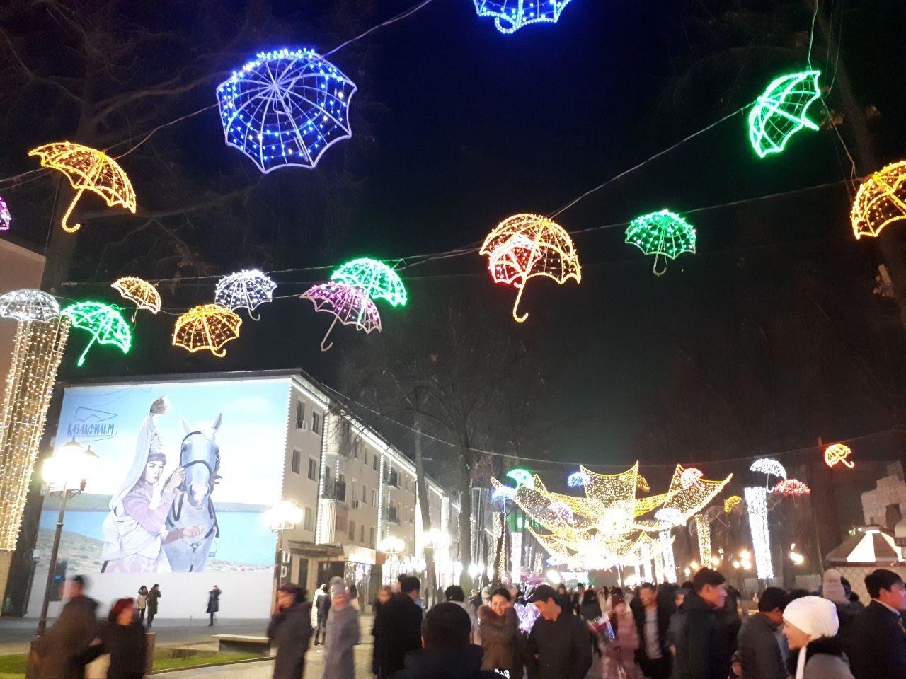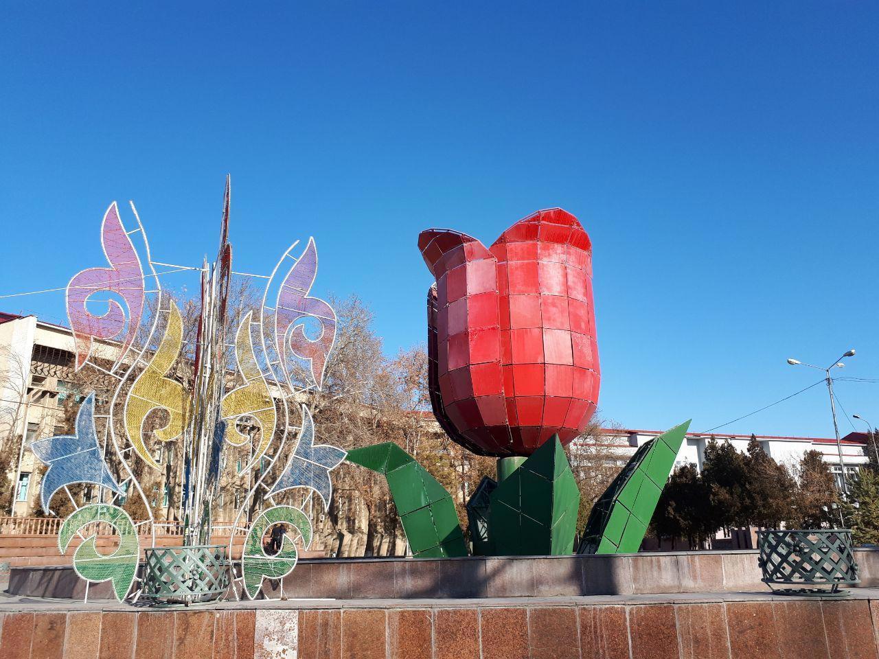 В Узбекистане очень любят втыкать на центральных улицах светящиеся штуковины, заказанные в Китае. Мода началась со столицы и докатилась до всех областей. Здесь пошли другим путём: устанавливают скульптуры и арт-объекты в национальном стиле, используют для оформления традиционные казахские орнаменты.