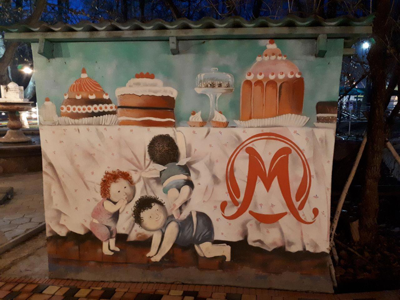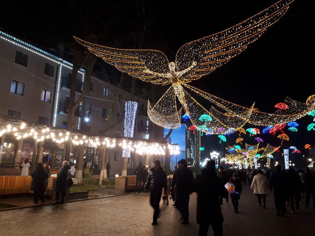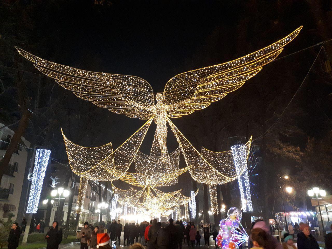 Новогодней (и не только) подсветкой здесь не злоупотребляют, но центральный бульвар сияет - над ним летят золотые трёххвостые ангелы.
