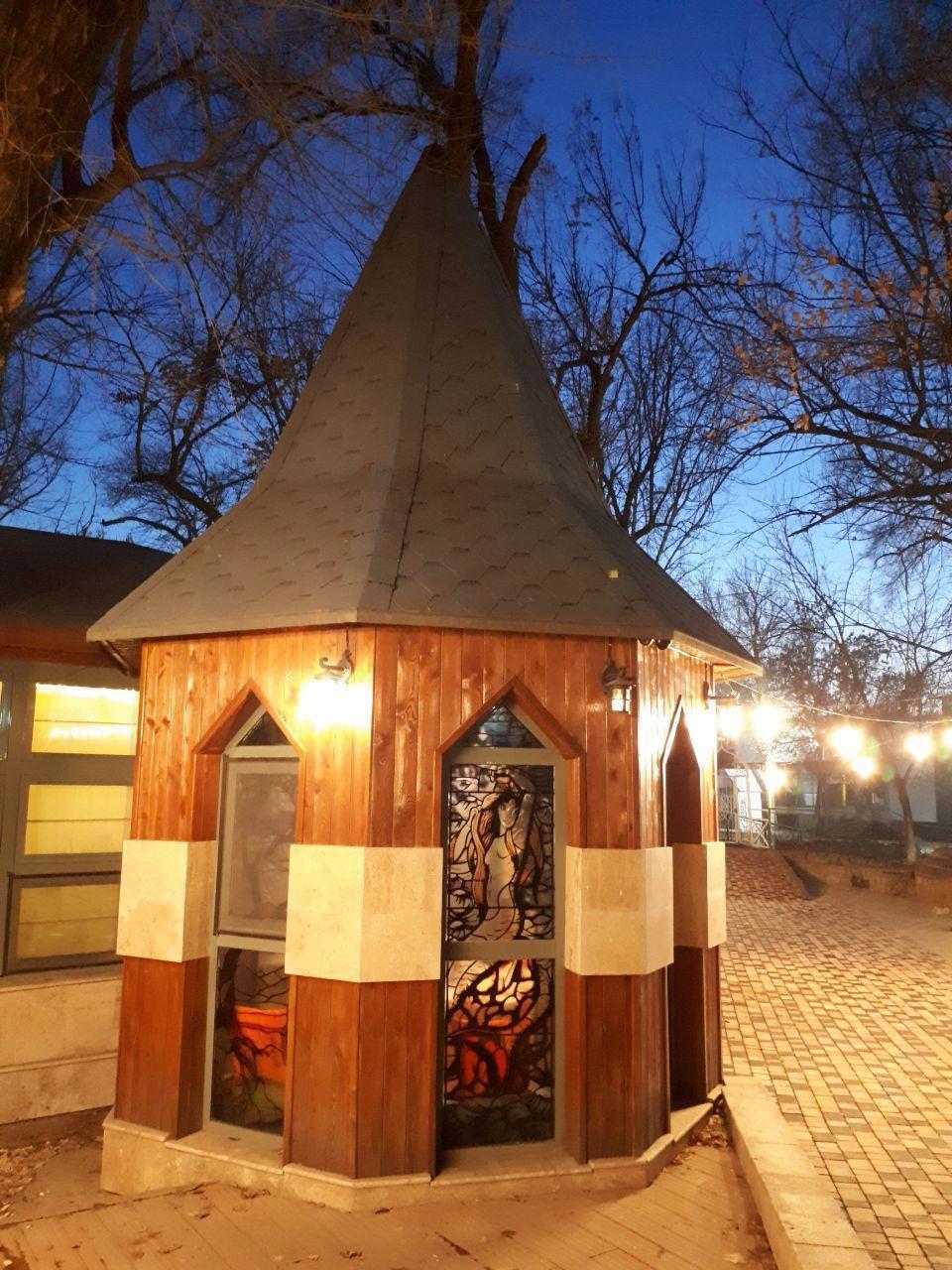 Попадается много забавных разностей: я углядела фонтан с огромным металлическим тюльпаном, Айболита явно восточного происхождения, балкон с шарами и муляжами птиц.