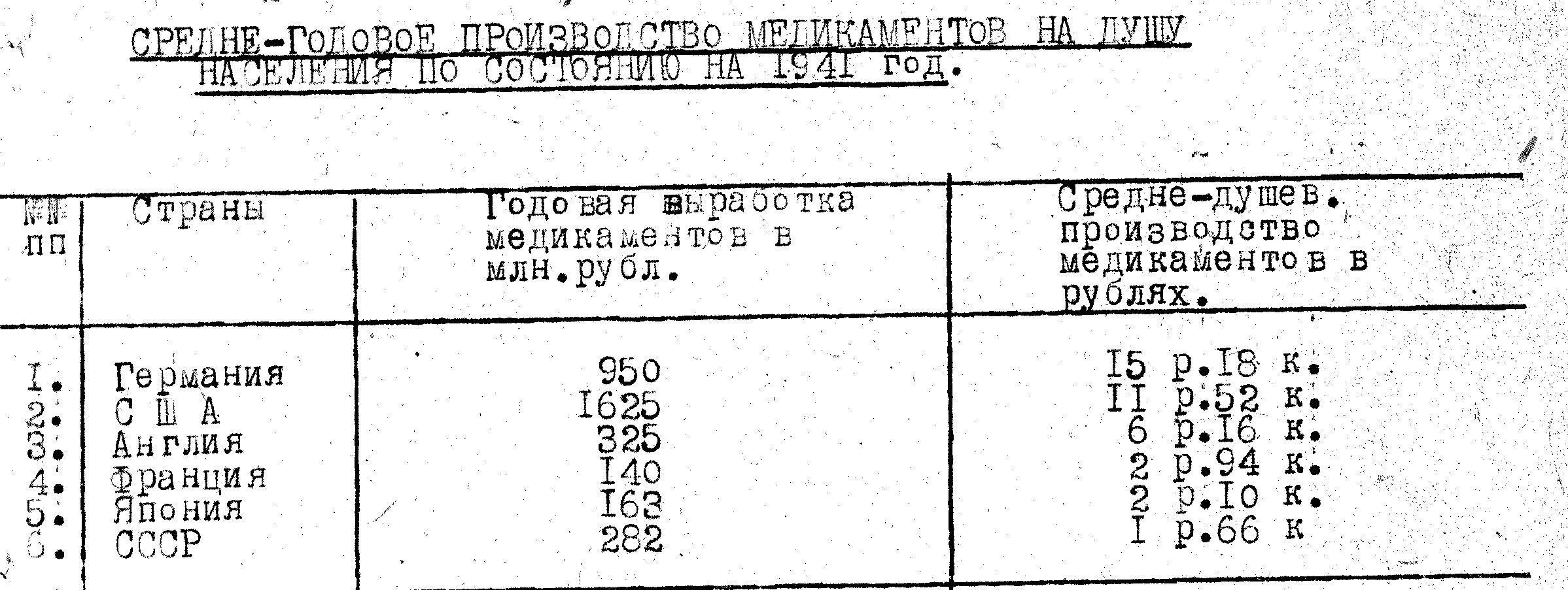 Как видно из вышеизложенного, начиная с 4-го квартала 1941 г. по первое полугодие 1942 года армия и страна не получали от промышленности медикаментов. Потребность в медицинских препаратах покрывалась за счет старых запасов.