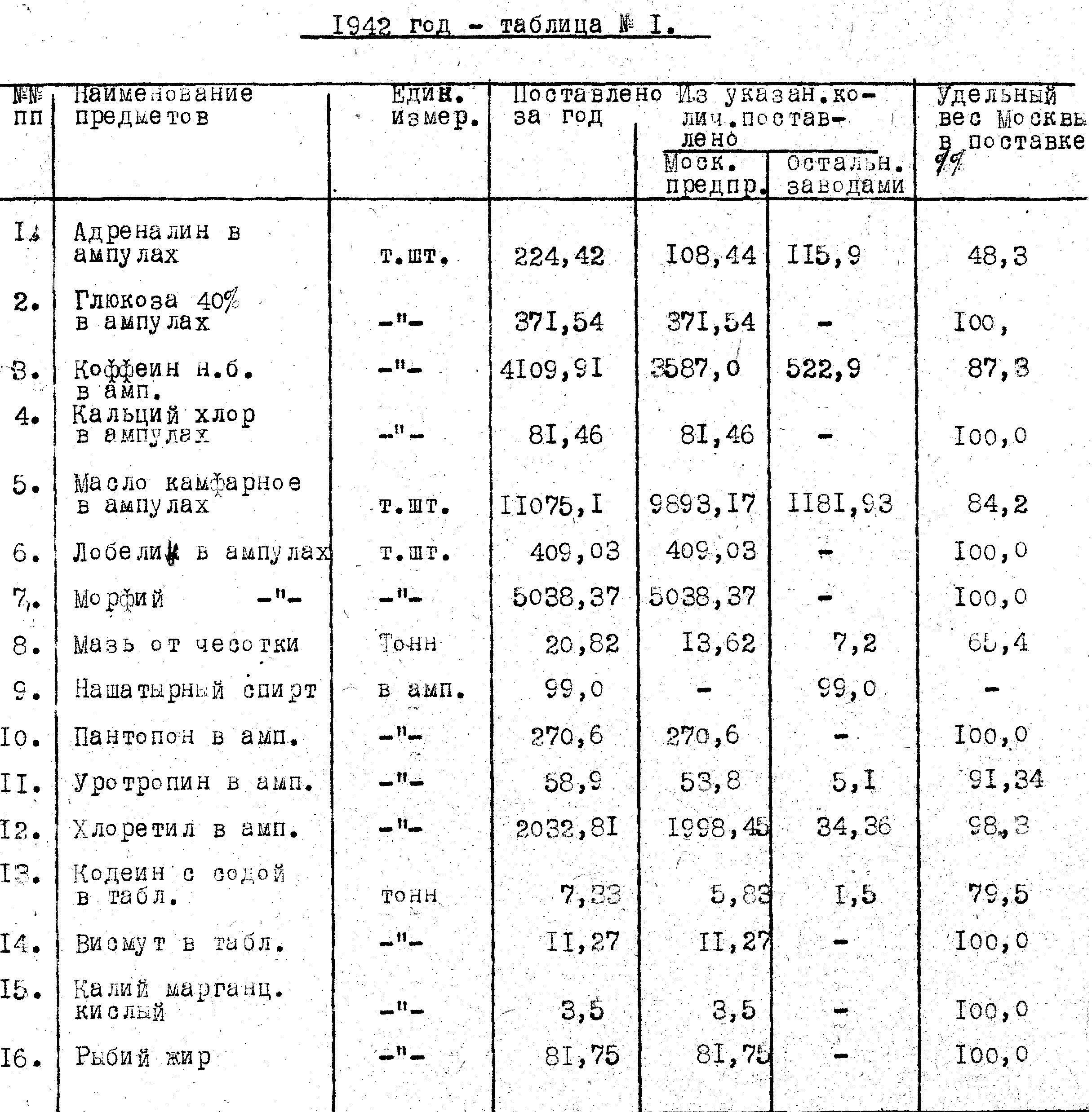 Так как заводы - поставщики нуждались в серьезной помощи со стороны Главного Военно-Санитарного Управления Красной Армии, и наиболее действенная реальная помощь могла быть оказана в Москве, вполне естественно, что наибольшая часть, поставок размещалась на предприятиях г. Москвы, что видно из следующих таблиц о поставке наиболее важных медикаментов за 1942., 1943 г. г.