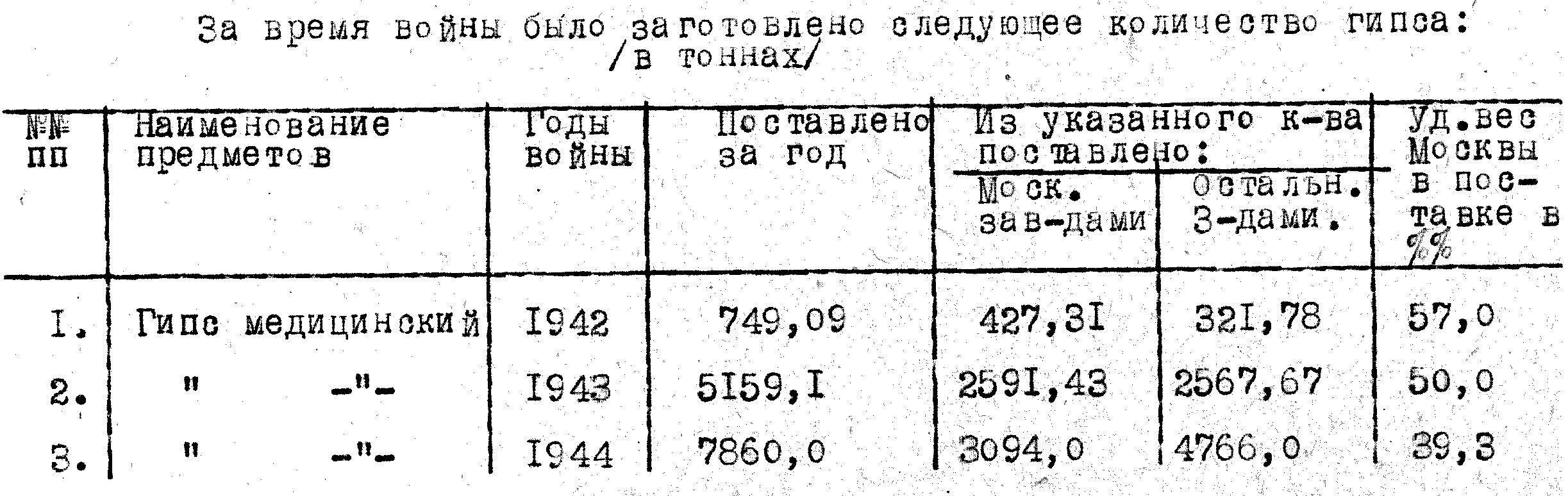 Фронтовые учреждения предъявляли громадный спрос на гипс. Получение гипса было весьма затруднено, ввиду того, что гипсовые заводы Донбасса и Львова вышли из строя. Усилиями заготовительного аппарата была обеспечена организация производства и получение гипса с Московского алебастрового завода, а также завода Исакогорского (ст. Исакогорка, Архангельской области) и Алексеевского.