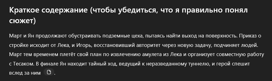 А в какой-то момент я обнаружила, что ИИ не в силах осмыслить связно более четырех авторских листов текста (по моему опыту, это примерно одинаковый показатель для всех ИИ чатов). Нейросеть начисто забывает, что было в самом начале, опирается лишь на последние 3-4 авторских листа, в итоге с таким соавтором вы рискуете сотворить нечто весьма поверхностное и ситуативное. Не цельное по структуре. Ведь на десятом авторском листе ваш "соавтор" уже не помнит, что было на первых страницах, скатываясь в откровенный бред.