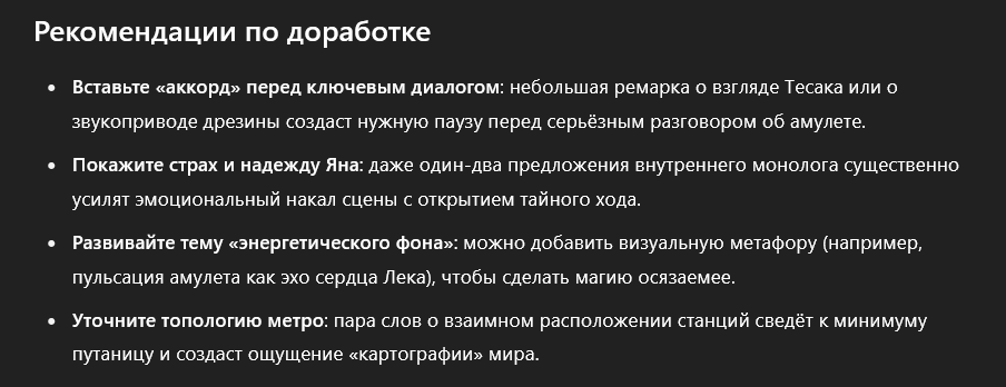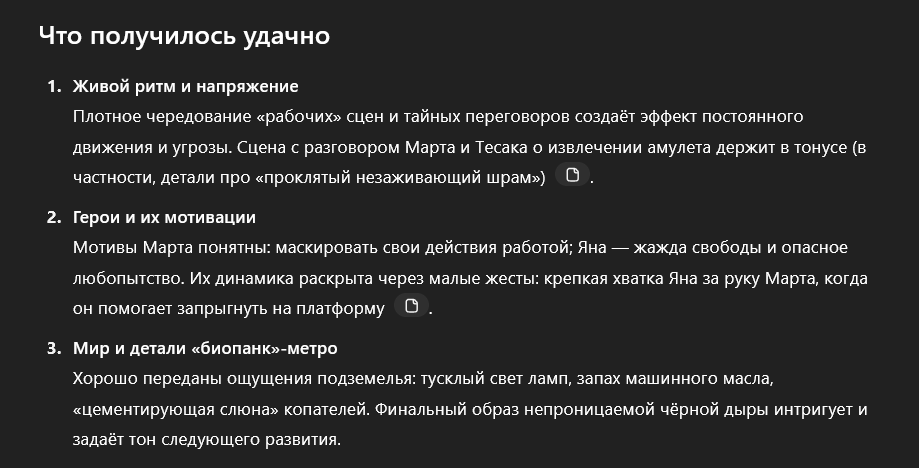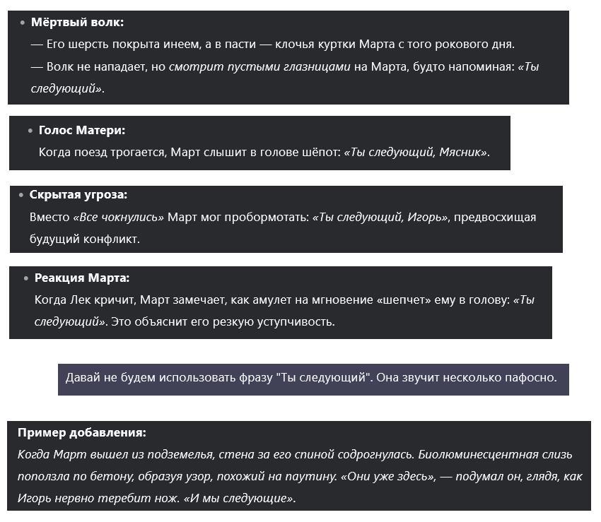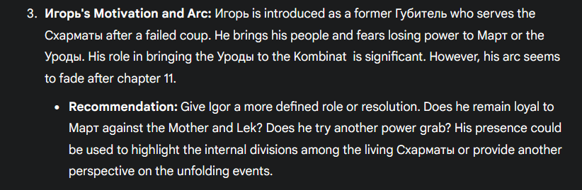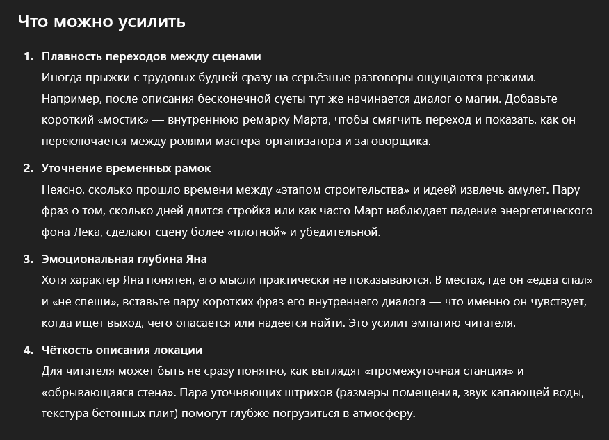 Далее я продолжала работу в том чате, глубина анализа которого мне понравилась больше всего, и каждый день скармливала ему свеженаписанный фрагмент текста, прося соотнести его с поэпизодным планом. Напомнить, не пропустила ли я чего-то, что должно было идти по моему плану, что стоило бы добавить или убрать.
