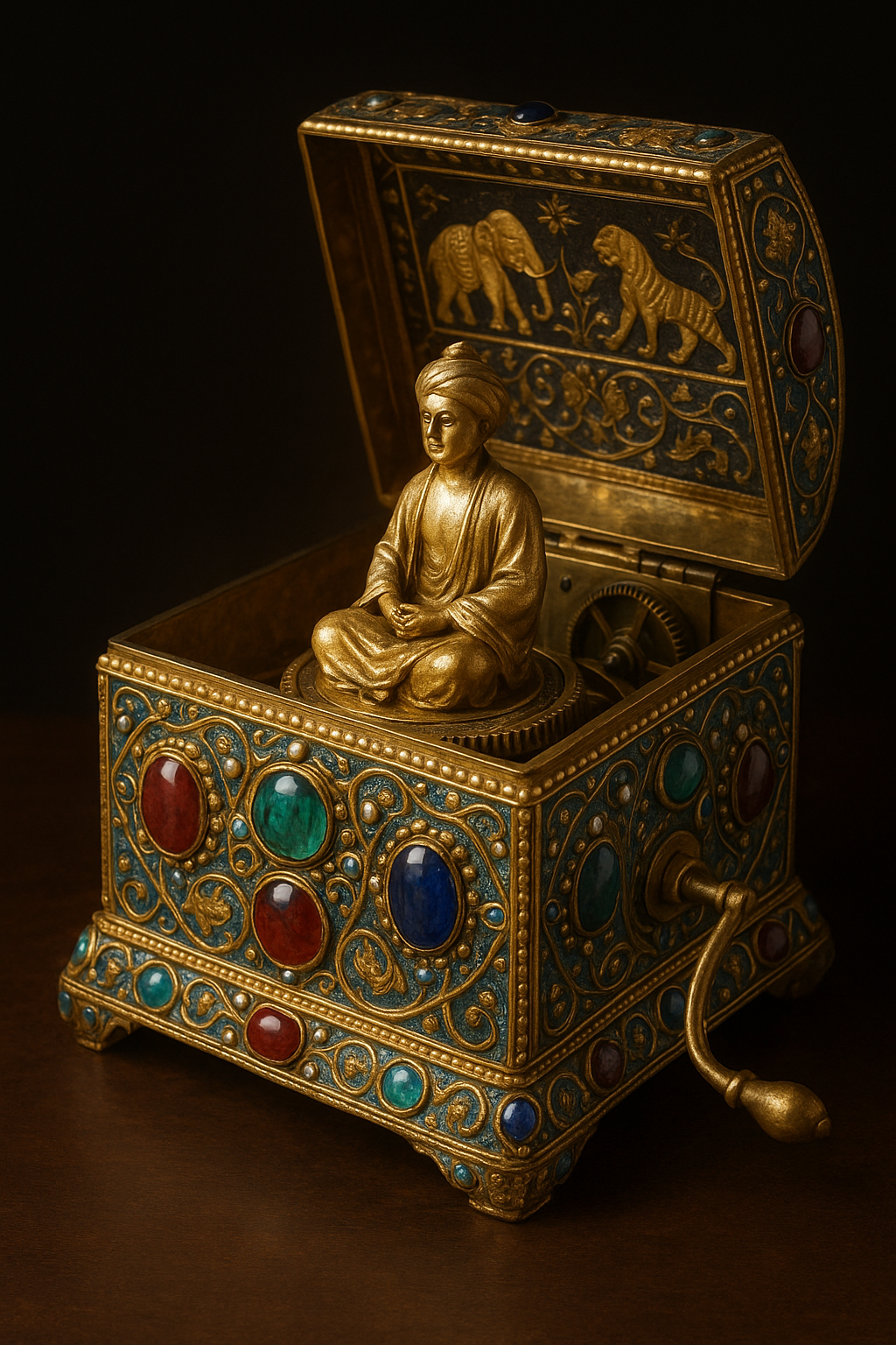 Купец достал шкатулку невиданной красы: каменьями блестящими убрана, узорами диковинными расписана. На крышке – звери заморские: слоны да тигры. А внутри – хитрый замок колёсный, да с пружинами. Стоит ручку железную повернуть несколько раз – откроется крышка, изнутри статуэтка сидячего человека появится, словно живая, кружась, и заиграет музыка.