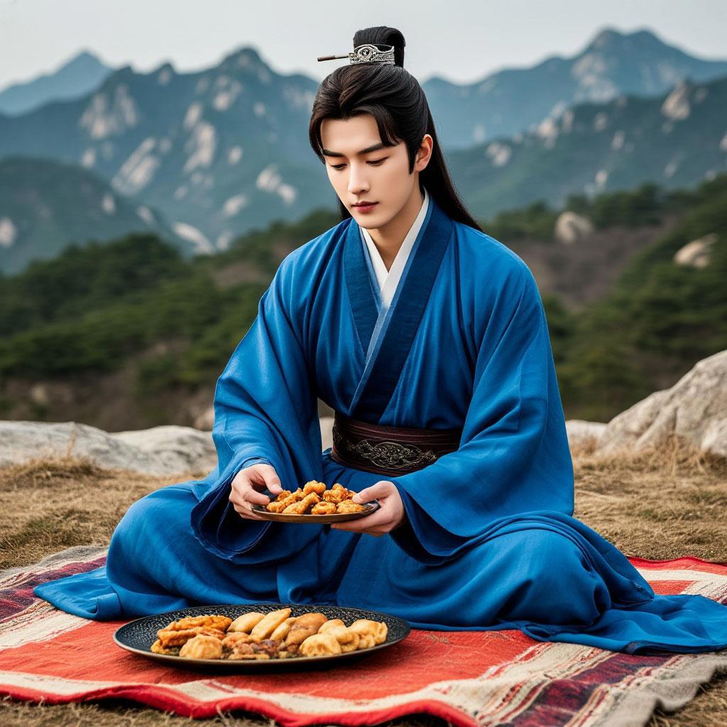 Достигнув широко уступа, он отпустил Юэминь и, развязав на себе накидку, подбитую белым мехом, бросил на камни. На этот своеобразный ковёр заклинатель поставил деревянную коробку с угощениями и опустился перед той на колени, открывая крышку.