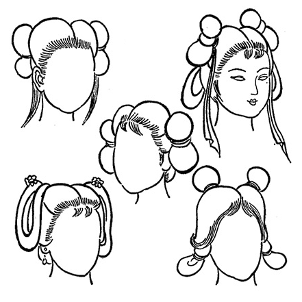 Двойные пучки, главный атрибут, по которому можно опознать несовершеннолетних гражданок древнего Китая и прислугу, существовал также в "висячем" виде - что отображено на многих произведениях изобразительного искусства. Причем, пучки можно было подвесить с боков, или ближе к затылку, или загнуть их кольцами, перетянуть ленточками, намотать на нос (вру) и сделать с ними множество других занимательных вещей, на которые богата юная безответственная фантазия.
