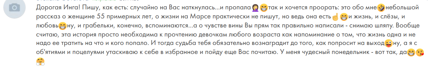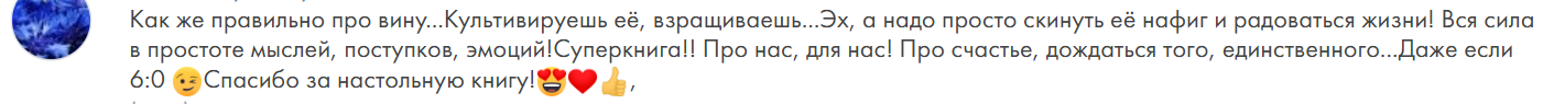 Всегда очень радуюсь искренним откликам. Не обычным комментариям, где читатели просто хвалят или порой "сливают" содержание книги, а именно словам из души. Когда читатель оценил историю через свою жизнь, опыт и чувства. Это отклики к книге "Правда Нади".