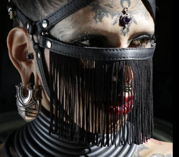 Это похоже на маску из полосок кожи. Но это “средний” вариант, бывают, разумеется, и более красивые и более страшные в зависимости от благосостояния террасорцев