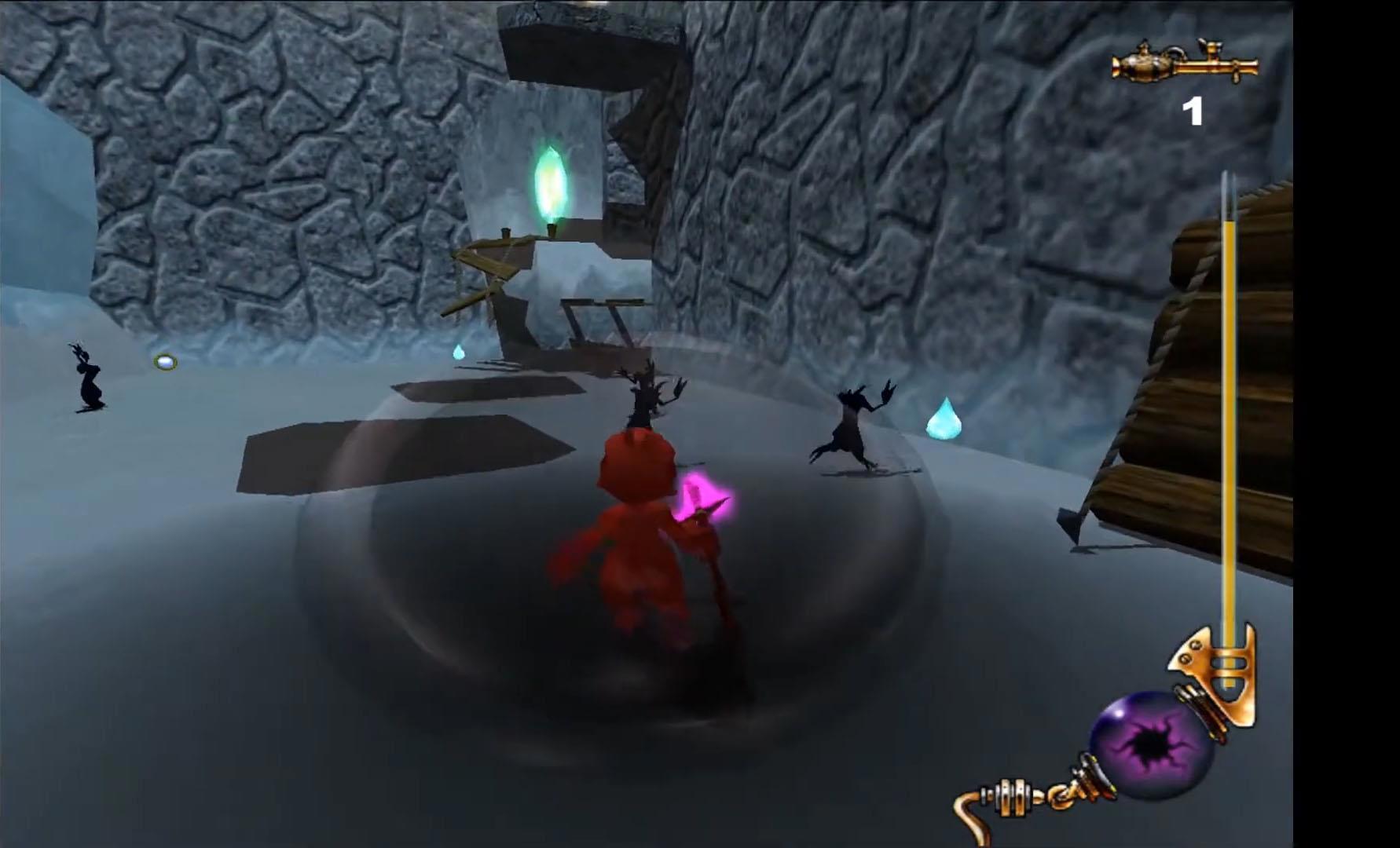 Скриншот из французской игры "Подарочек" (2000) - малоизвестной и своеобразной, но сделанной интересно и с душой. Тот самый ледяной уровень. В игре есть оригинальные решения - например, на скриншоте враги неуязвимы для обычного оружия, но боятся темноты, поэтому их можно разгонять и убивать пузырём из энергии тьмы. Кому интересно, я записал полное прохождение "Подарочка".