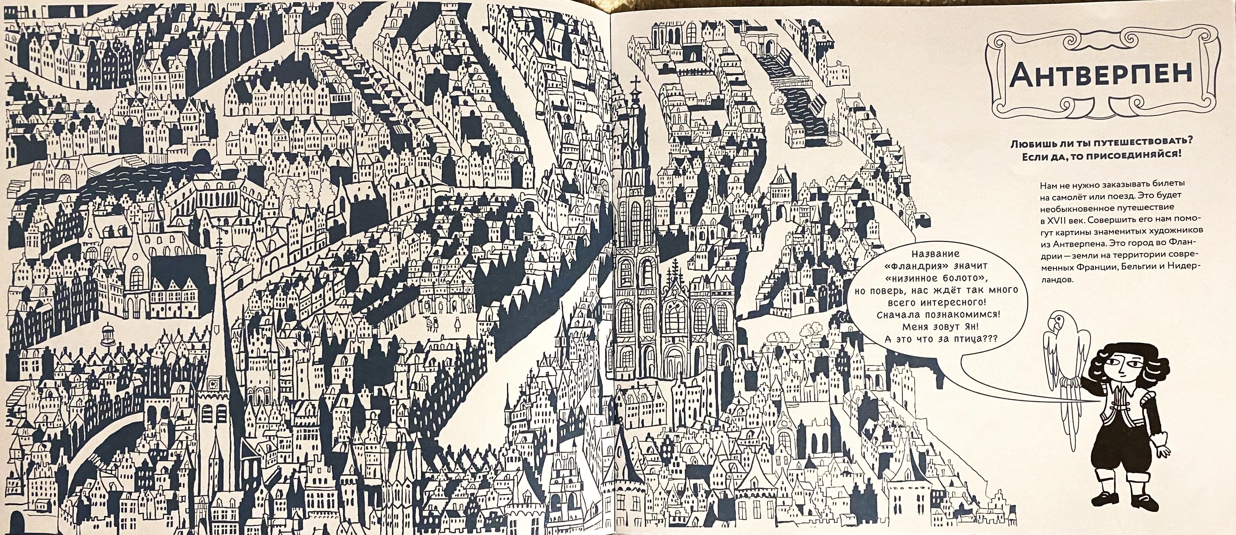 Но не думайте, будто в раскраске все серьезно, как в учебнике. Нет, это путешествие по фламандскому городу Антверпену, который проводит мальчик Ян из XVII века, а комментирует прогулку говорящая птица попугай!