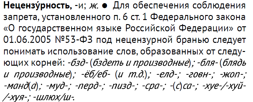 Ранее в России утвердили «Толковый словарь государственного языка Российской Федерации» СПбГУ как один из нормативных словарей, справочников и грамматик, фиксирующих нормы современного русского литературного языка при его использовании в качестве государственного (постановление Правительства России №1102-р). В этом словаре, помимо названых Роскомнадзором нецензурных слов, перечислены еще десять: -бзд- (бздеть и производные); -елд-; -говн-; -жоп-; -манд(а); -муд-; -перд-; -сра-; -(с)са-; -шлюх/ш-. В Роскомнадзоре заявили, что хоть такие слова и относятся к ненормативной лексике, «нецензурной бранью с точки зрения русского языка они не являются».