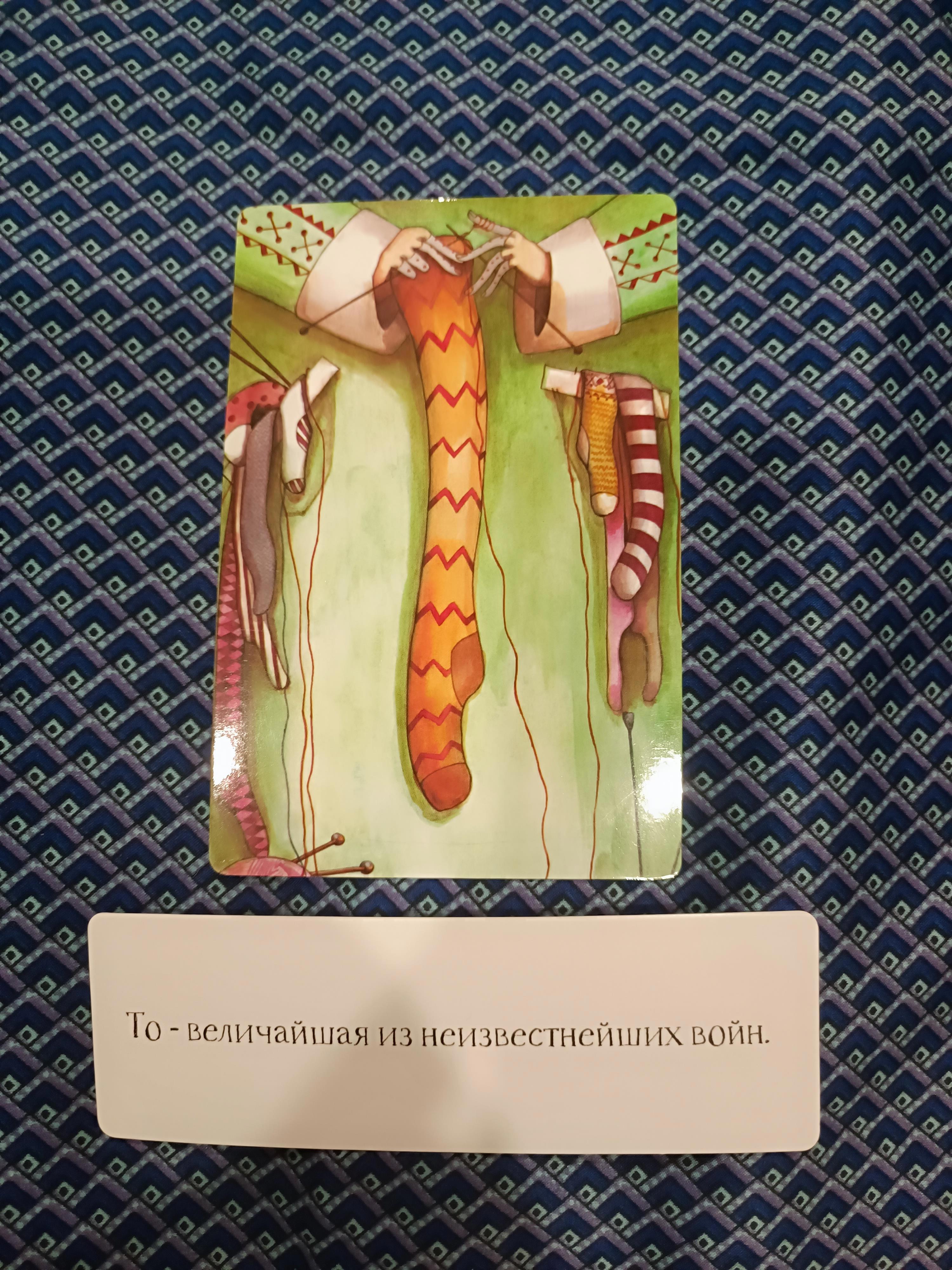 — Ого, мне редко попадается эта карта. Но она такая уютная. Смотрите, сколько всего здесь. Носочки, гольфики, ниточки, спицы. И творчество — всё узорное, разное. Труд и творчество. Ваши идеи, от небольших рассказов до длинных романов, всё это — бытовая магия. А вот касательно подсказки, могу трактовать её, как борьбу различных произведений за ваше авторское внимание.
