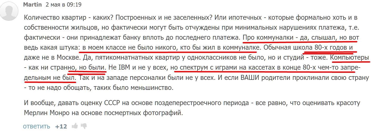 Самый свежий страдатель по СССР оказался сыном парторга на сталелетейном заводе с мамой заведующей производством в столовой= меняли, покупали, сдавали жильё в наём, так словно это были не 60е-70е, а вполне себе 2010е. Нет даже в2010 вряд ли возможно получать от государства новую квартиру на юге через три года после получения старой. Человек до сих пор прибывает в уверенности, что все эти операции с жильём в СССР были законны и вообще в порядке вещей.