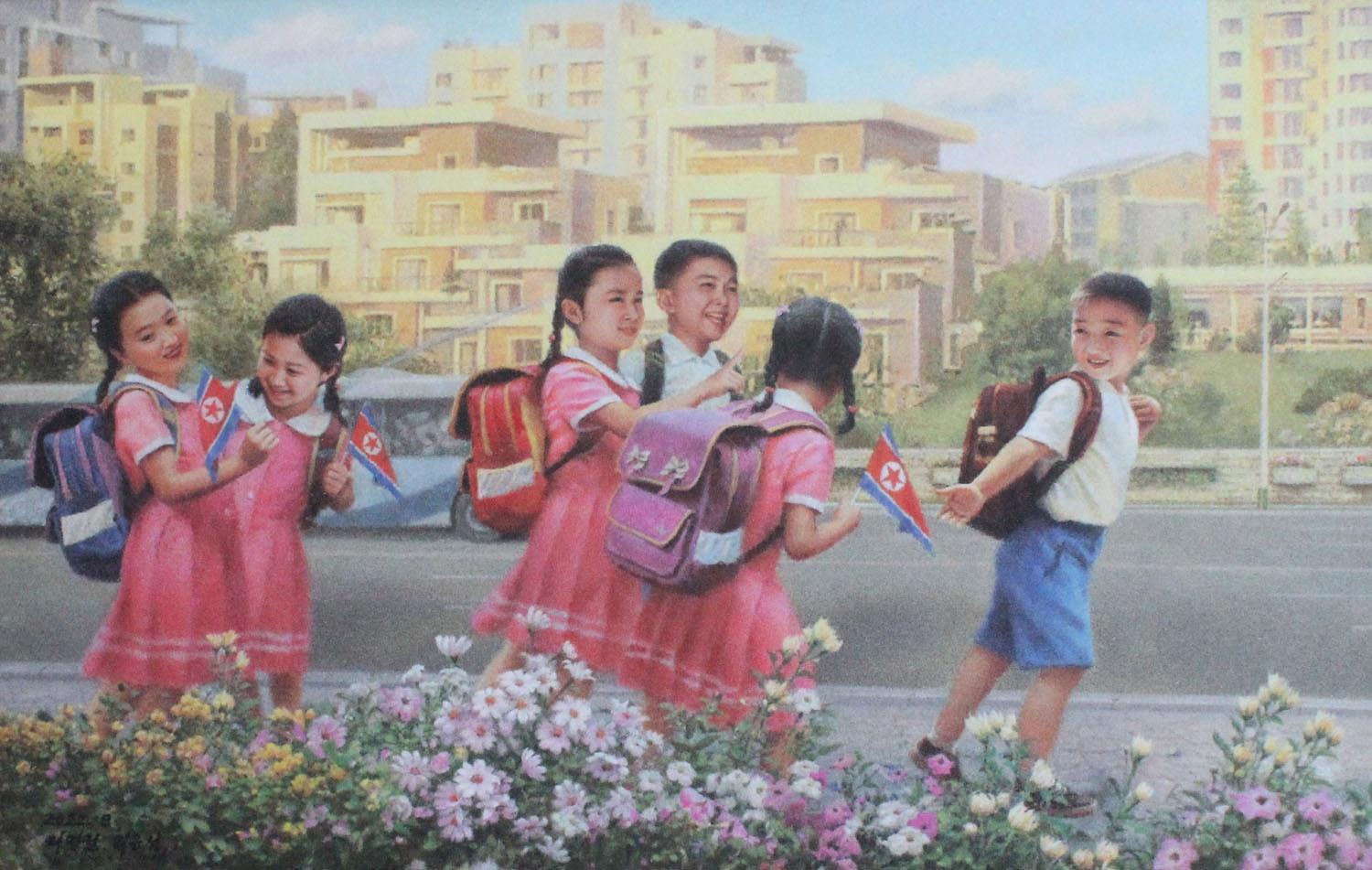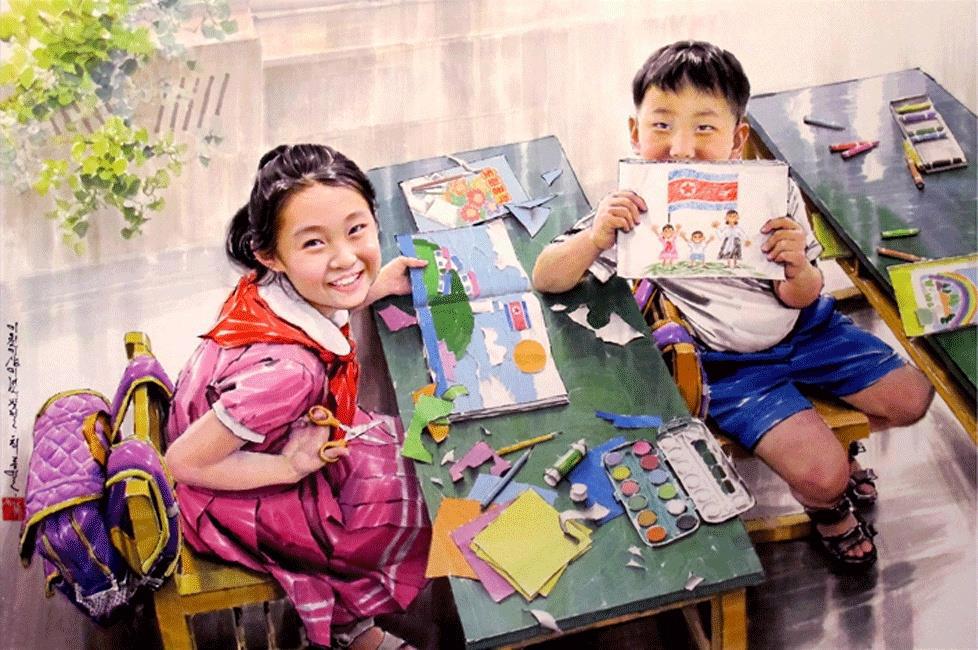 "Картина изображает счастливых детей, рисующих в одной из многочисленных островных школ-филиалов в отдаленных районах КНДР."