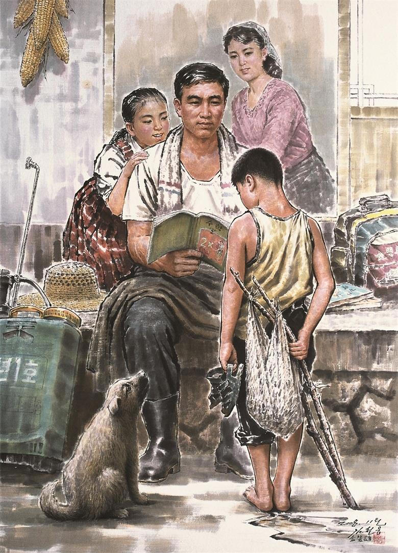 "Папа проверяет домашнее задание". Художник Ким Чол Унг, 2008 г. (97 г. чучхе).