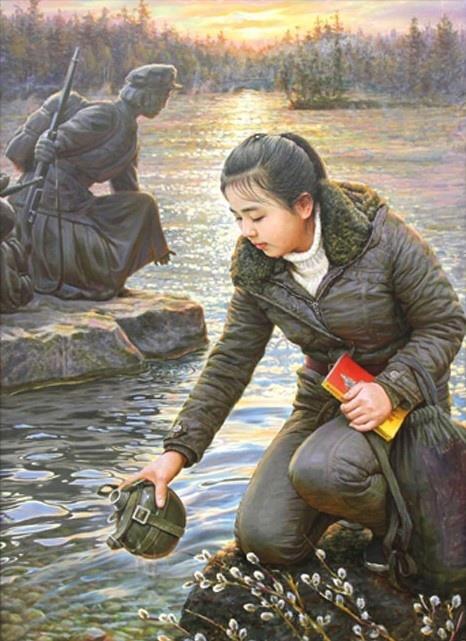 "Картина изображает девушку, путешествующую по местам революционной борьбы. Она черпает воду из озера Самджи у подножия вулкана Пэктусан и ощущает тёплую любовь к родине, передавшуюся от предков-партизан спустя поколения."