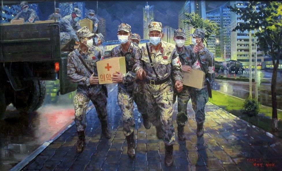"Картина изображает героических военнослужащих Корейской народной армии, которые работали день и ночь во многих городах КНДР, чтобы помочь нуждающимся людям и стабилизировать жизнь в напряжённые дни трёхмесячной противоэпидемической битвы."