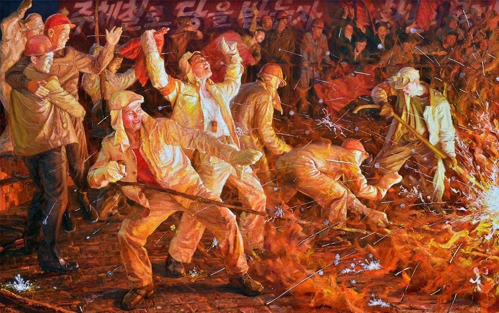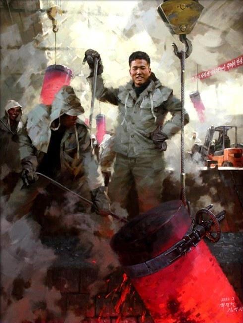 "Первый выпуск чугуна Чучхе - чудесное событие на металлургическом комбинате Хванхэ". Художник Ри Рён Гук, 2018 г. (107 г. чучхе).
