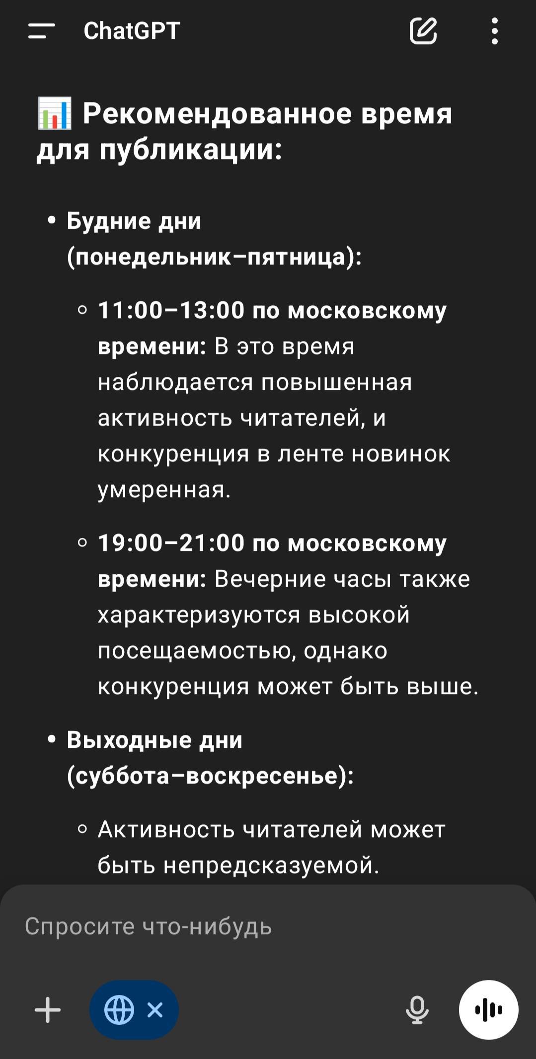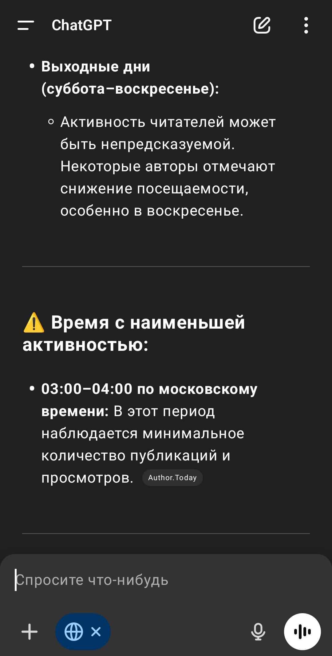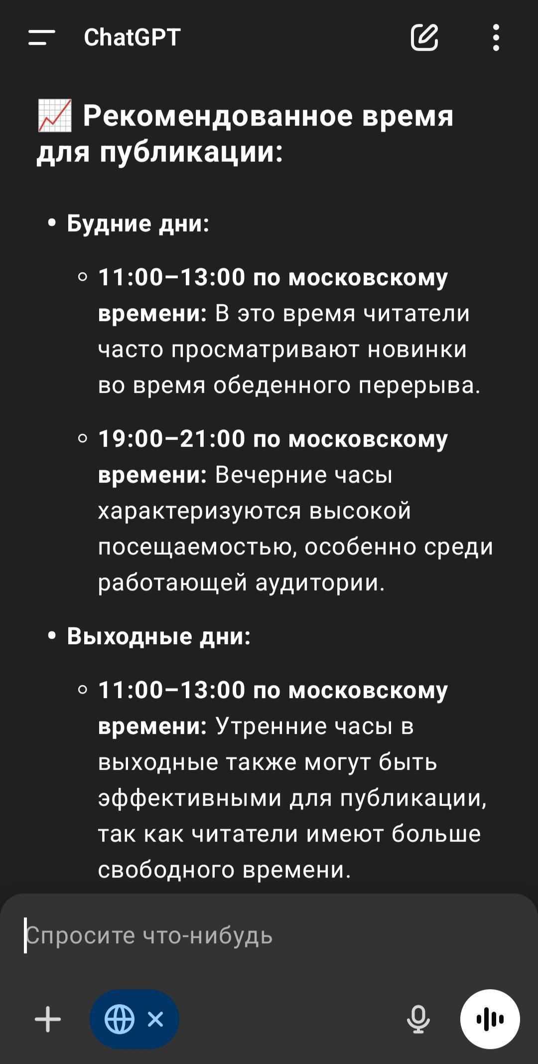 Автор: Владислава АзисChatGPT проанализировал активность пользователей и дал рекомендации для писателей, которые хотят опубликовать или обновить свои книги в так называемый «час пик».