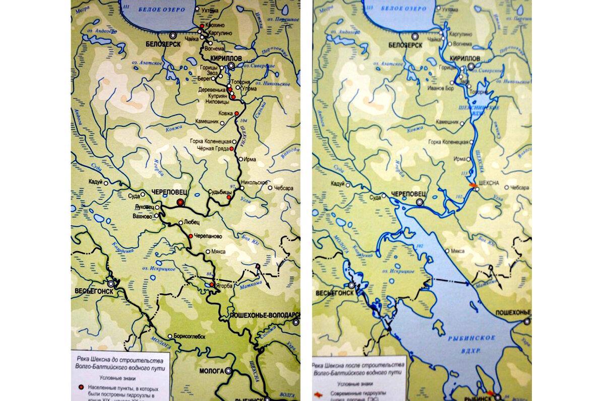 А так выглядела Шексна до ХХ века, и так она выглядит сейчас, сравнительная карта (к сожалению не смогла найти первоисточник карты)
