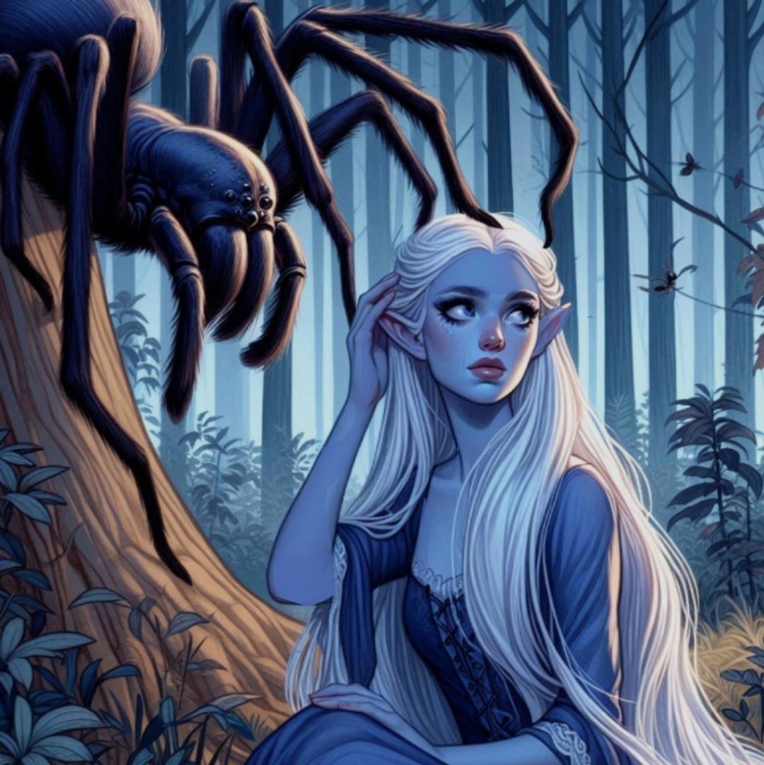 Теперь про светлых, тёмных, и тех, кто ни туда, ни сюда. В нашей истории дроу - не отдельная раса, а особый эльфийский дом. Тёмными стали называться эльфы, принявшие покровительство богини-паучихи Ллос. Та наградила своих последователей умением растворяться в тенях, безупречно видеть в темноте, угадывать будущее по тайным знакам и управлять ночными животными. Но взамен она потребовала принесения кровавых жертв, что светлые эльфы считали недопустимым. В результате дроу были изгнаны за Нильв и вынуждены поселиться в Паучьих горах - в скудном и неприветливом краю.