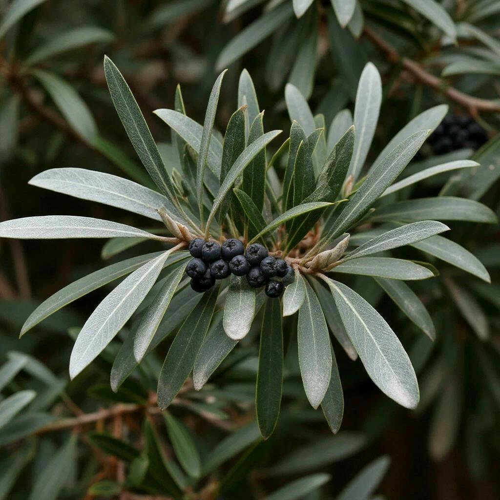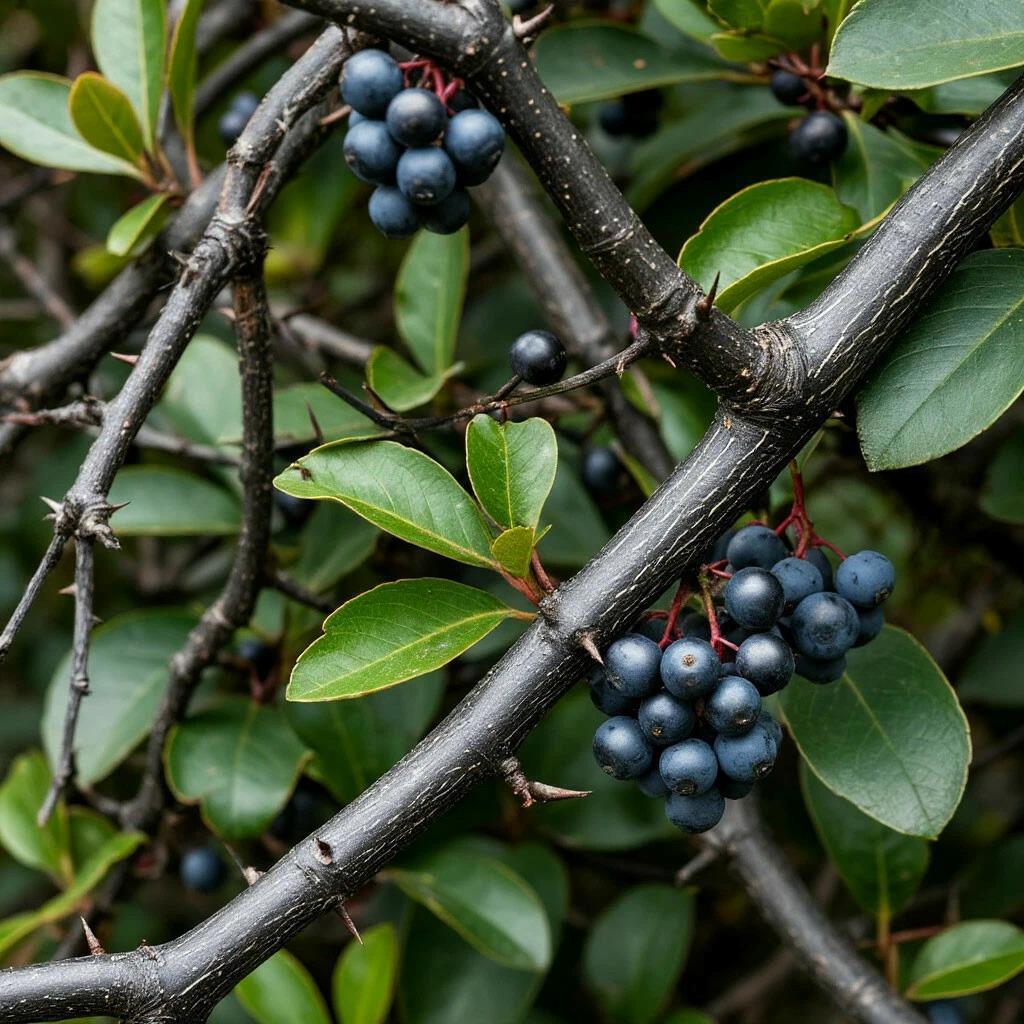 - Описание: Небольшое вечнозеленое деревце (5-7 м) или крупный кустарник. Кора гладкая, пепельно-серая, холодная на ощупь. Листья узкие, кожистые, темно-зеленые с серебристой изнанкой, не опадают, а постепенно высыхают на ветке, становясь пепельно-серыми. Цветы мелкие, невзрачные, кремовые. Плоды – мелкие черные ягоды. Уникальность: при любом повреждении (слом ветки, порез коры) растение выделяет обильный бело-серый сок, быстро застывающий в порошкообразную субстанцию, похожую на пепел ("Ясень").