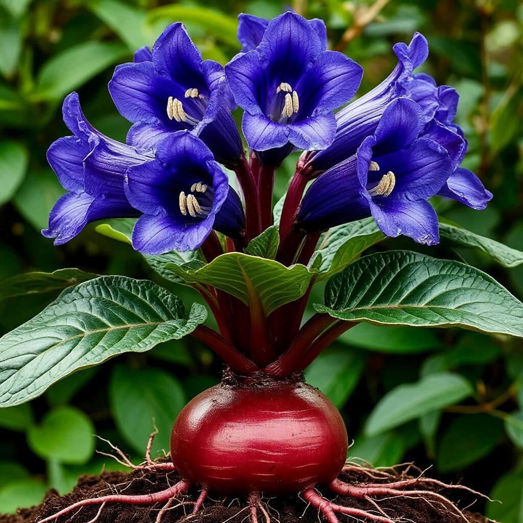 * Описание: Крупное растение (до 1 м) с мощным стержневым корнем темно-бордового цвета. Стебли толстые, сочные, темно-зеленые. Листья крупные, овальные, глянцевые, с выраженными прожилками. Цветы – главная достопримечательность. Крупные (5-7 см), трубчатые, глубокого сапфирово-синего цвета, собранные в мутовки на верхушке стебля. Из центра каждого цветка постоянно сочится прозрачная, слегка вязкая жидкость ("слезы"), обладающая сильным горьким запахом. Сок стебля и корня молочно-белый, едкий.