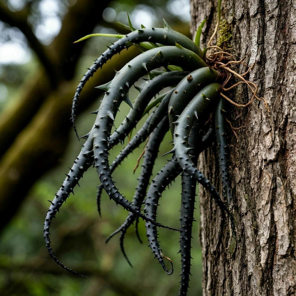 - Описание: Паразитическая лиана или эпифит, растущая исключительно на древних, темных деревьях (дубах, тисах, черных вязах). Не имеет листьев. Ее длинные (до нескольких метров), тонкие, гибкие стебли угольно-черного цвета цепляются за кору хозяина с помощью острых, крючковатых шипов ("когтей"). На концах стеблей образуются видоизмененные почки – твердые, заостренные, черные "шипы-наконечники" длиной 5-10 см, пропитанные ядом. Растение почти невидимо в тени кроны.