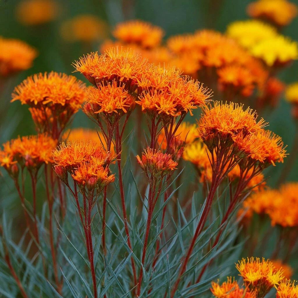 - Описание: Однолетняя трава высотой 30-50 см. Стебли тонкие, красноватые. Листья мелкие, игольчатые, сизо-голубые. Цветы необычные: мелкие, трубчатые, собраны в плотные верхушечные соцветия. Окрас лепестков – ярко-оранжевый или алый у основания, переходящий в ослепительно желтый к краю, как рассвет. Каждый цветок раскрывается ровно на рассвете и увядает к полудню, испуская облачко мельчайшей, переливающейся оранжево-желтой пыльцы ("Вздох").