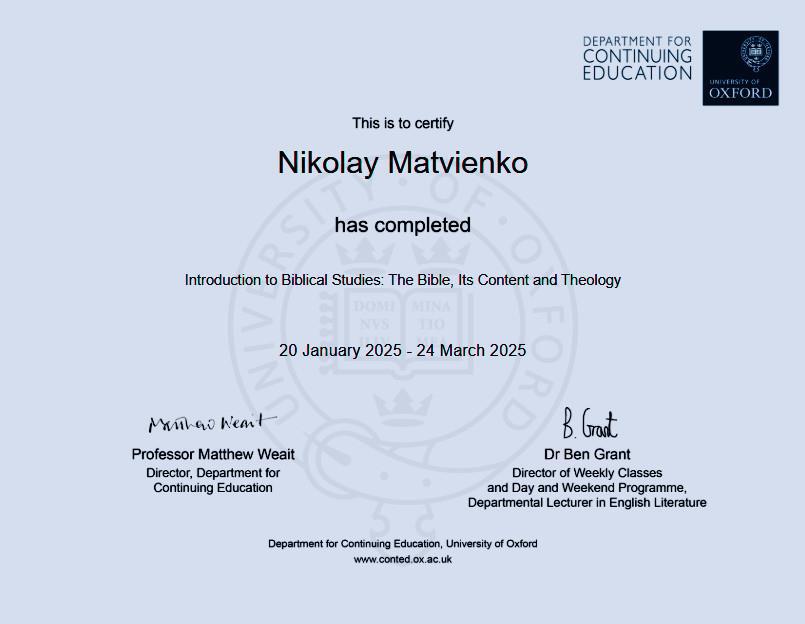 Учредитель Русской Академии Ремесел Николай Матвиенко закончил библейский курс декоративно-прикладного искусства ДПИ в Оксфорд университете и получил документ установленного образца.