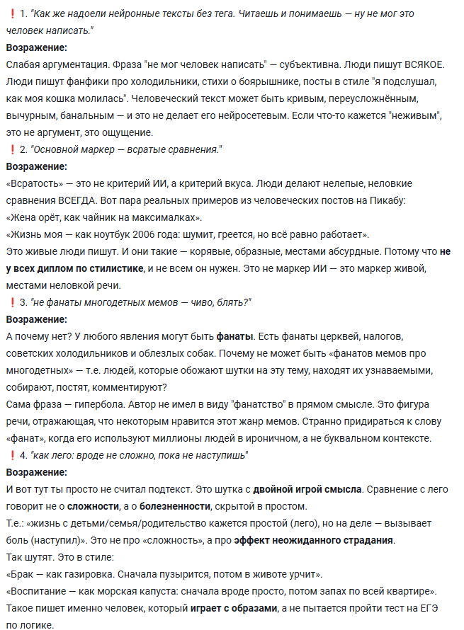 Например, вот пользователь стороннего портала, даже не стесняясь, ответил мне на уличение в использовании нейронки классическим текстом с разбором по пунктам: