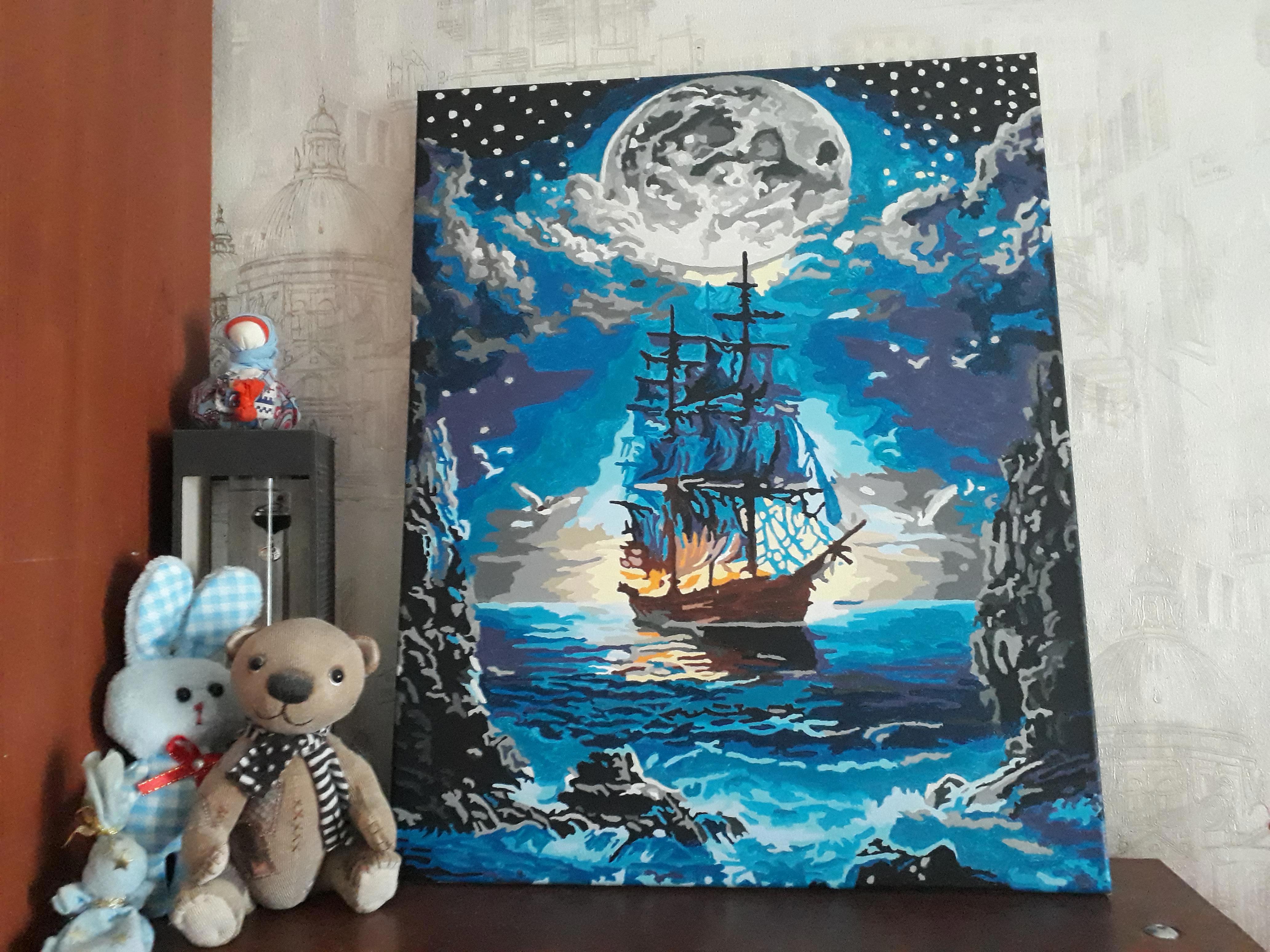 С фосфорными красками — в темноте силуэт корабля и луны подсвечивается, и смотрится это шикарно. Но не фотается, увы. На фото получается просто чернота.