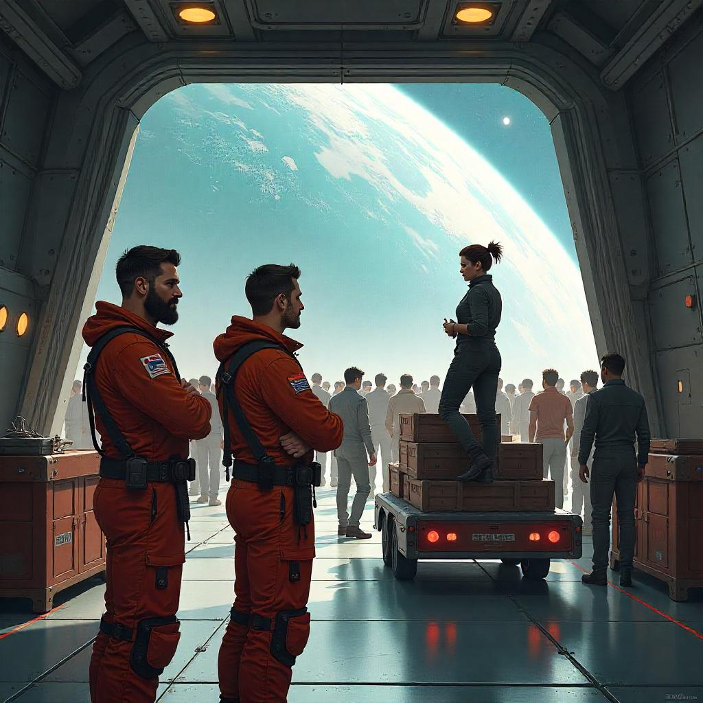 Макс и Хольми стояли прямо под инфостендом, хмуро рассматривая толпу бедняков, которые выходили с прибывшего грузовика. Мия, которая в силу своего роста не могла себе такого позволить, забралась на погрузочную тележку и высматривала в толпе лейтенанта космофлота. Им всем казалось, что это просто. Вот толпа простых людей, и в ней должен быть один-единственный офицер в синей форме, да его должно быть издалека видно.