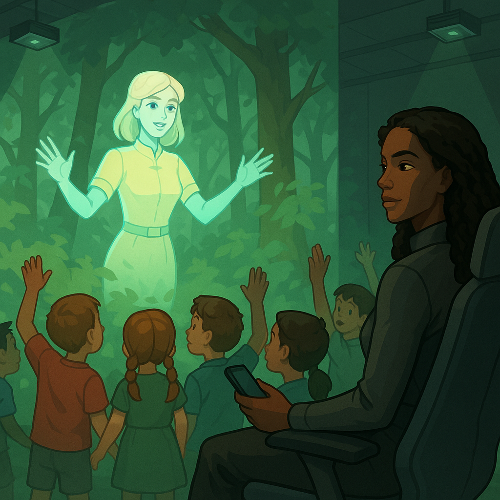Детишки, окружённые трёхмерными изображениями с разных проекторов, восторженно следили за имитацией довоенной любительской хроники. Комната преобразилась в чащу леса: сверху доносились птичьи трели, под ногами хрустел высохший мох, и листья в пышных кронах деревьев шелестели под свежим ветерком.