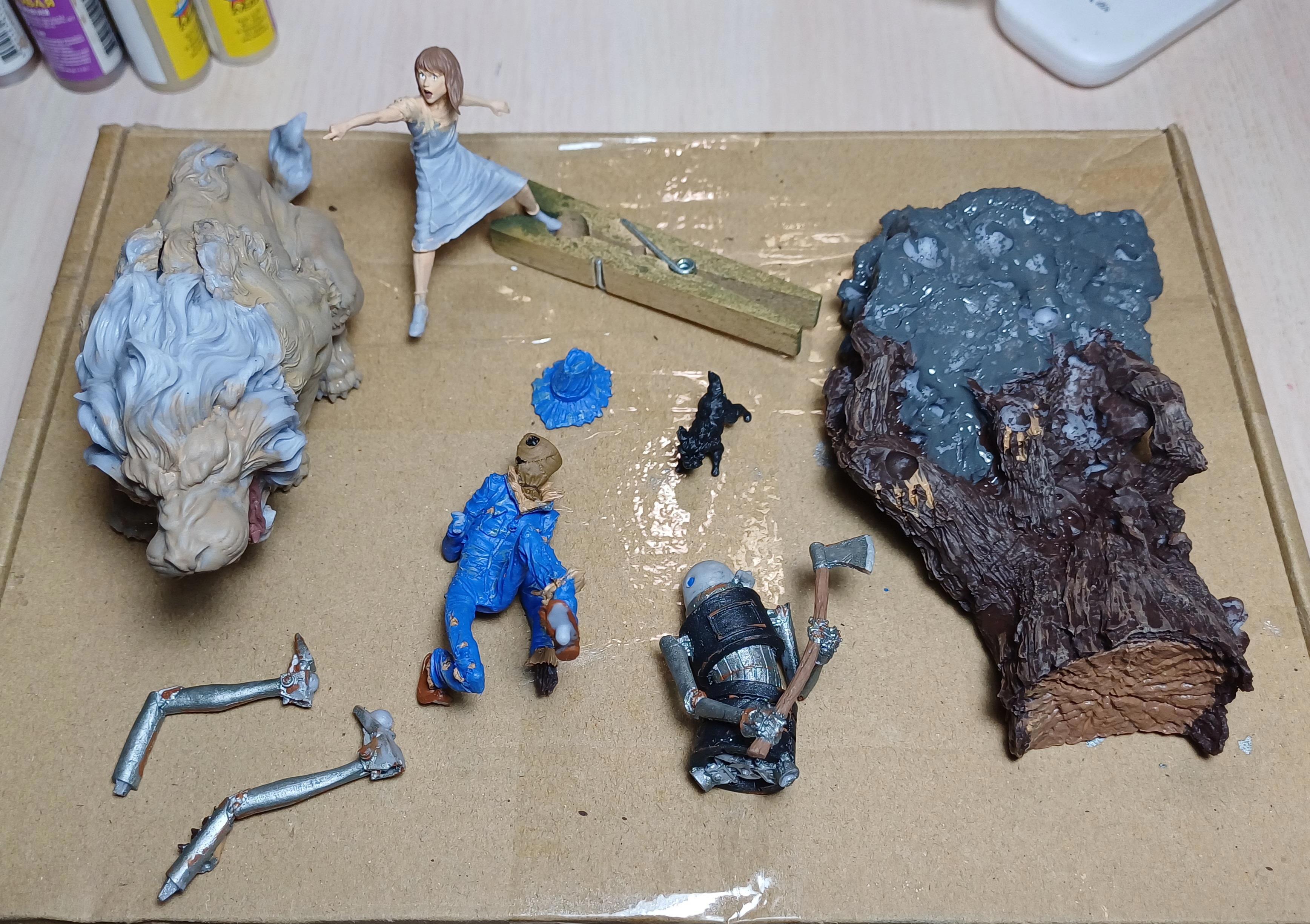 1, литературно-моделистское. По итогам покупки краски возобновил работу над виньеткой по "Волшебнику Оз". Затонировал Страшилу и Дровосека, положил пробный слой краски на Льва, поэкспериментировал с подставкой. Посмотрим, что будет дальше.