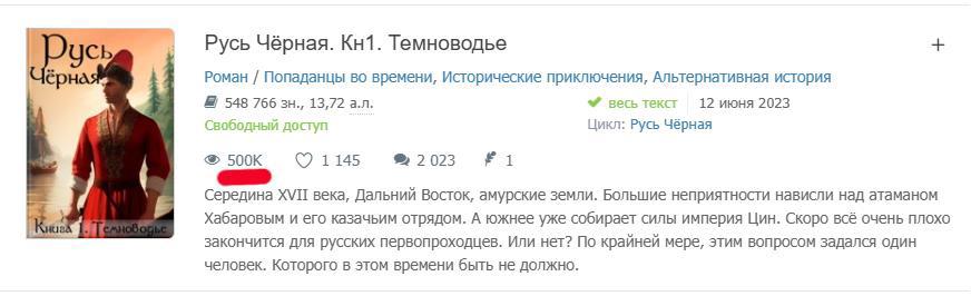Удивительно, но первой этого порога достиг не «Император Сухоруков» - мой главный успех и просто более старая по времени публикации книга. Нет, вперед бодро вырвалась «Русь Черная»! Которую тоже неплохо приняли… но многие читатели хаяли нестандартное начало и пиздили меня виртуальными тапками за концовку… Но «Русь» победила!))