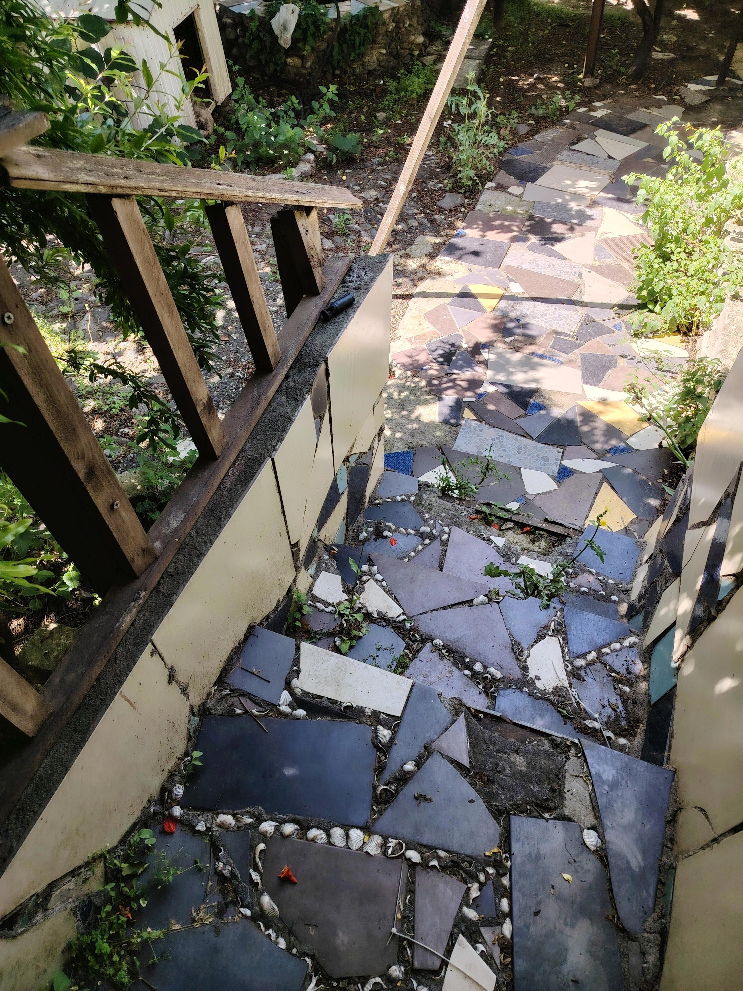 Это крылечко. Я все собираюсь устроить на нем посиделки. Может, даже с блокнотом. Какая-то из плиток внизу жутко скользкая, но какая именно, я пока не поняла.)) Слева будка без собаки и палка, что подпирает бельевую веревку.