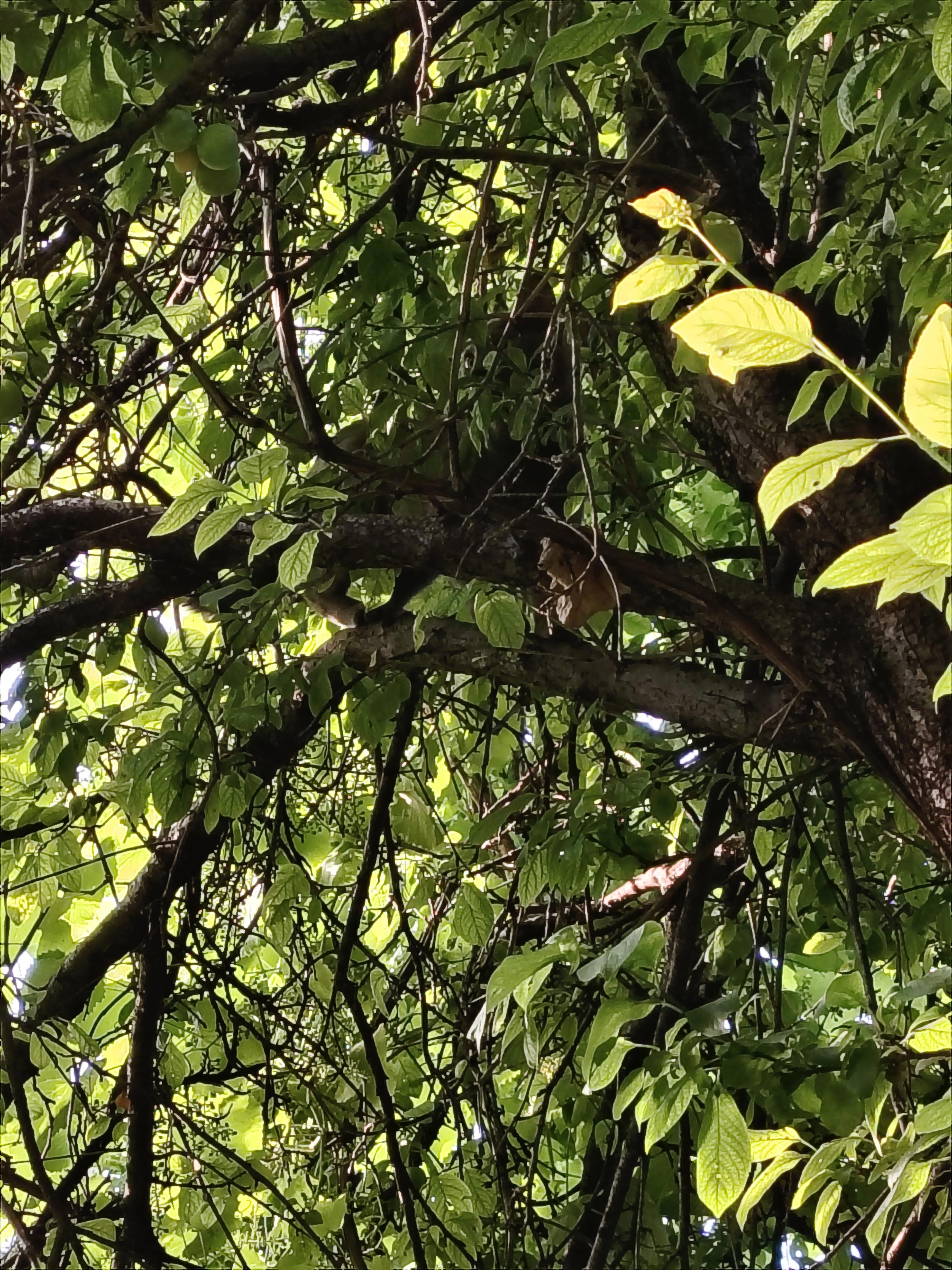 Кота не видно, а он там есть.))) К Нейте регулярно ходят женихи. Это один из них. Котя его загнала на дерево и потом задумчиво смотрела снизу.