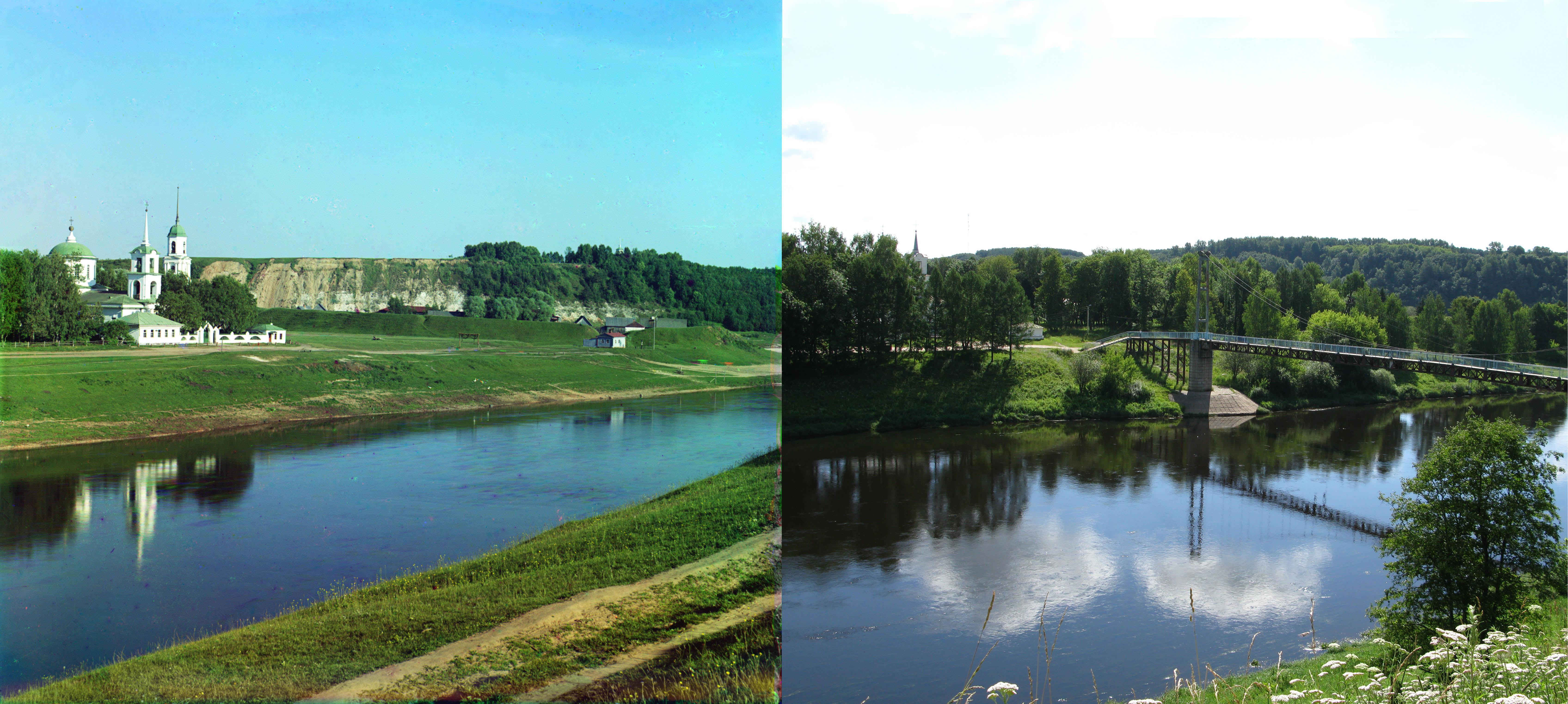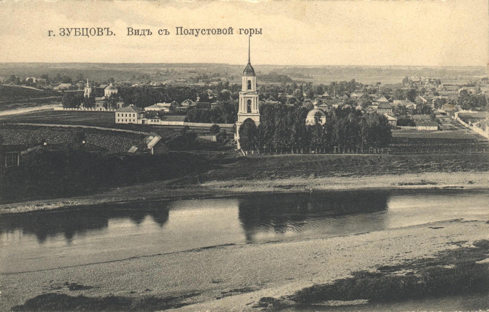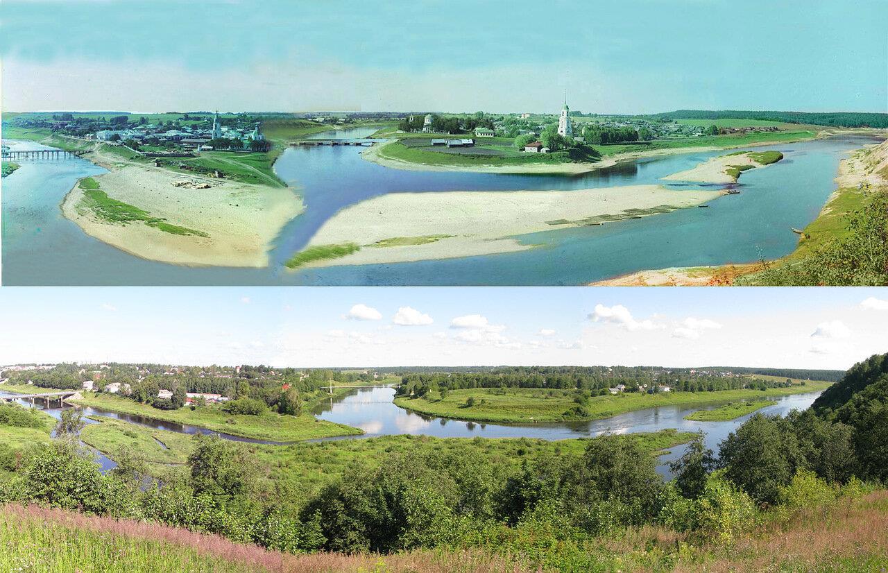 Верхнее фото - Сергея Прокудина-Горского, панорама г. Зубцова, около 1910 г. Это вид с Полустовой горы - то, что увидел Кошкин. Городище Зубцова 12 века располагалось на этом полукруглом "полуострове". Спаса-Преображенская церковь на нем до наших дней не дожила