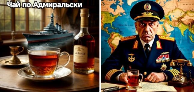 И вот как то утром зазвонил внутренний телефон на столе у адмирала (этот телефон он себе выбил потоком жалоб, хотя ему было некому по нему звонить). Мелодичный женский голос услышав, что на той стороне линии находится адмирал Иванов, радостно сообщил, что товарищу Иванову как начальнику сектора положено спецобслуживание из спец-буфета и если он желает, то ему будет подан чай по адмиральски*, чего адмирал естественно пожелал. Через какое-то время в дверь его одинокого в этом коридоре кабинета раздался вежливый стук и симпатичная девушка в наколке и фартуке , поставила перед ним стакан чая по адмиральски в массивном подстаканнике и маленькую шоколадку "Алёнка". И когда он уже допивал чай, из динамика радиосети внезапно раздалась песня о крейсере Варяг, и так случалось с каждым визитом официантки, причём каждый её визит коньяка в стакане становилось чуток больше, а чая соответственно всё меньше и кажлый раз из динамика звучал Варяг.