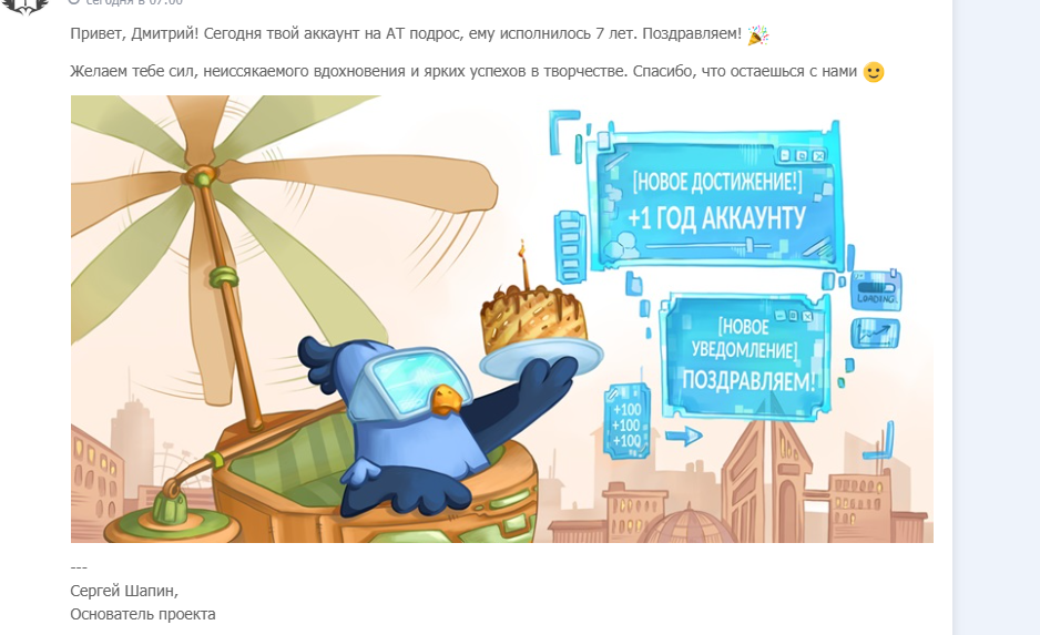 Автор: ДмитрийСегодня семь лет как я пришёл на АТ! наверное заходил и раньше, но зарегистрировался именно семь лет назад. По этому поводу получил поздравление от Сергея Шапина вот оно!