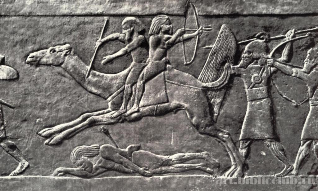 Впервые верблюжья кавалерия упоминается в письменном источнике (на монолите из Карха) в связи с битвой при Каркаре, произошедшей в 853 году до н.э. В сражении, в котором коалиция сиро-хетских царств, Египта и Израиля безуспешно пыталась остановить ассирийское вторжение в Левант, на стороне союзников принимала участие и тысяча всадников-арабов на верблюдах.