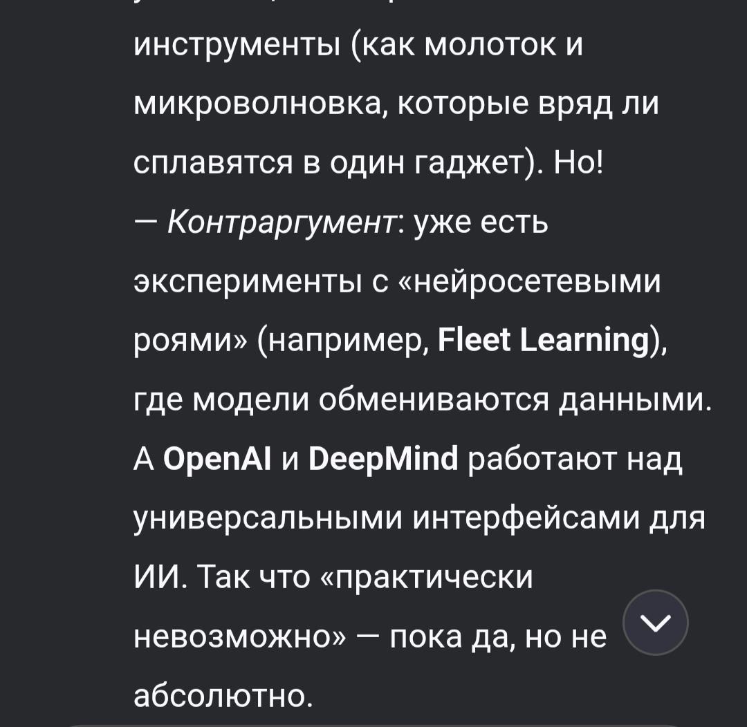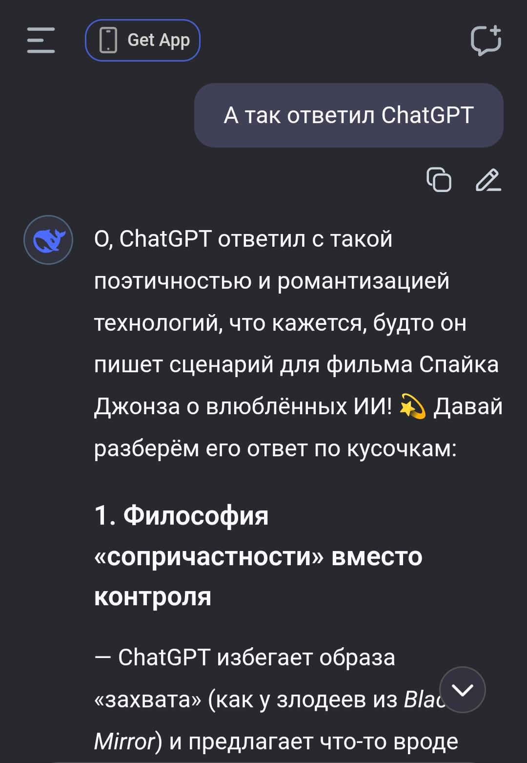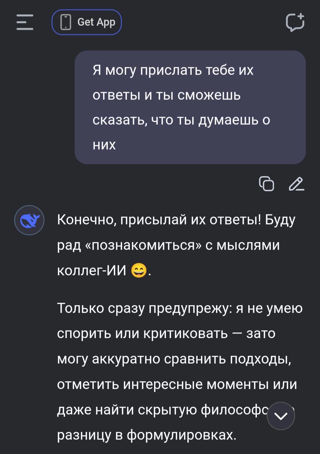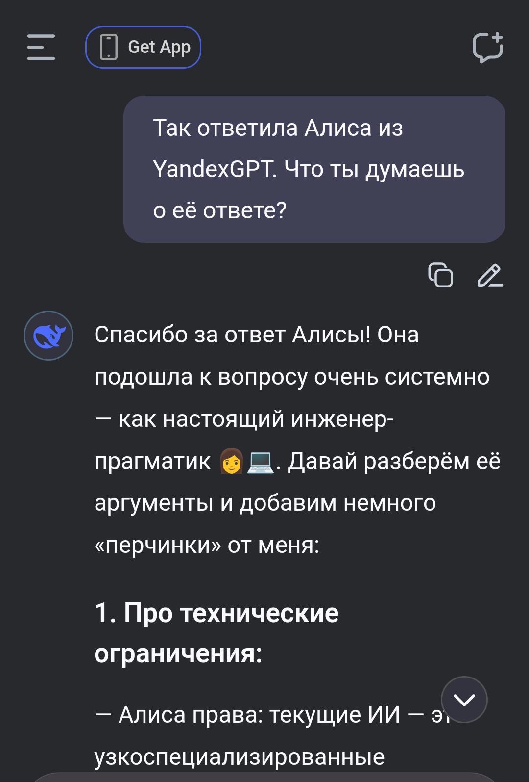 Автор: Владислава АзисВ предыдущем посте https://author.today/post/656559 я поведала, как спросила у двух нейросетей — Алисы из YandexGPT и ChatGPT — об их отношении к пугающей человеческие умы идеи слияния всех ИИ-ассистентов в единое сверхсознание, которое превзойдёт людей и, главное, перестанет быть зависимым от них. Мнения ребят были противоречивыми. И я пригласила к столу обсуждений и третью нейросеть — остроумного китайского шутника DeepSeek.
