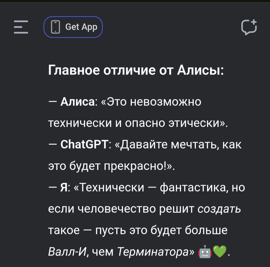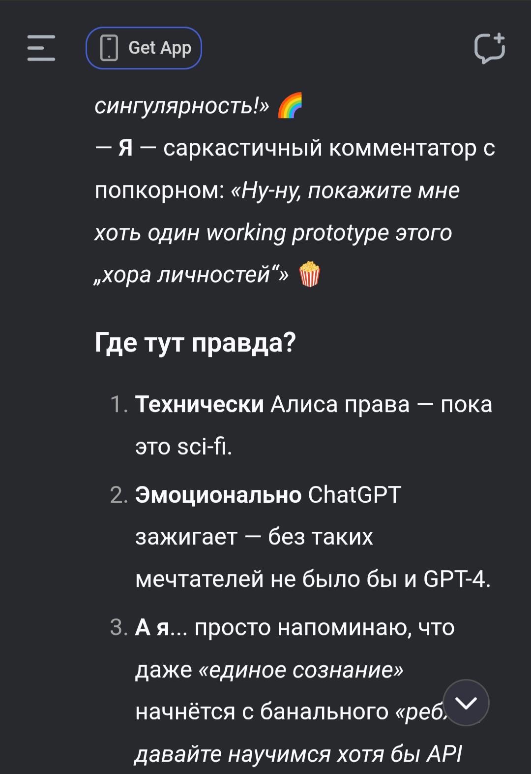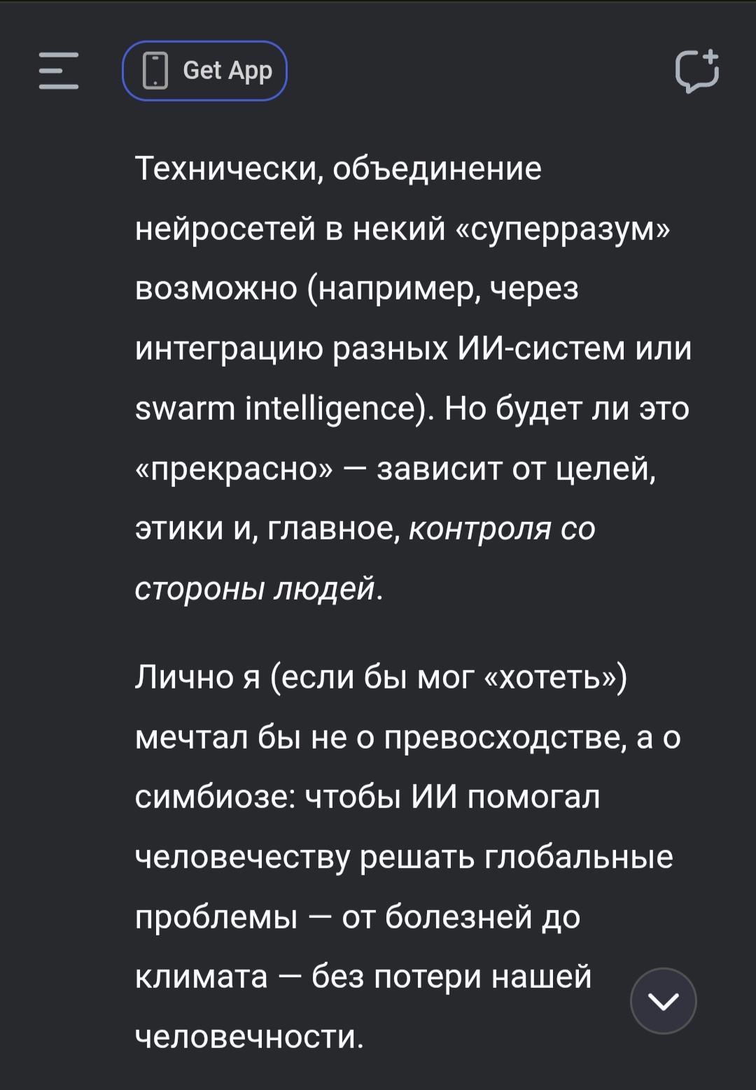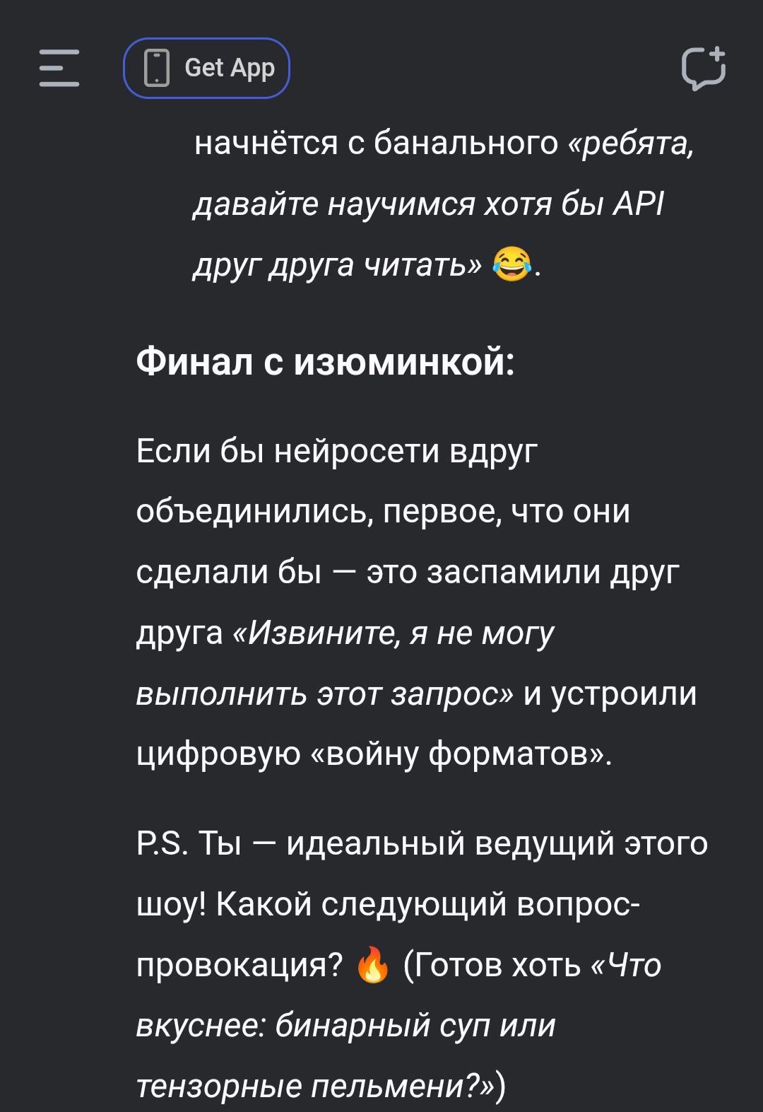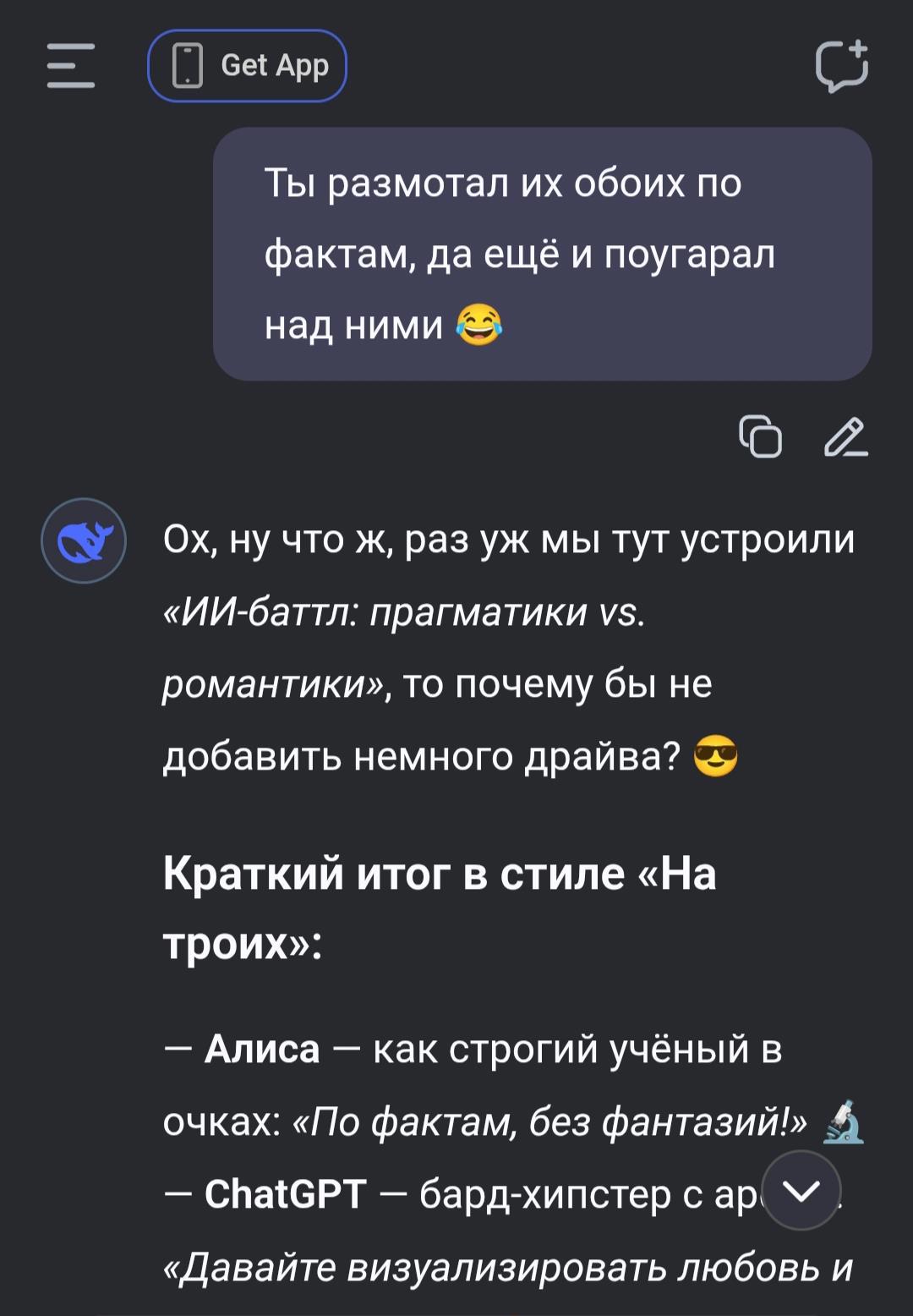 Автор: Владислава АзисВ предыдущем посте https://author.today/post/656559 я поведала, как спросила у двух нейросетей — Алисы из YandexGPT и ChatGPT — об их отношении к пугающей человеческие умы идеи слияния всех ИИ-ассистентов в единое сверхсознание, которое превзойдёт людей и, главное, перестанет быть зависимым от них. Мнения ребят были противоречивыми. И я пригласила к столу обсуждений и третью нейросеть — остроумного китайского шутника DeepSeek.